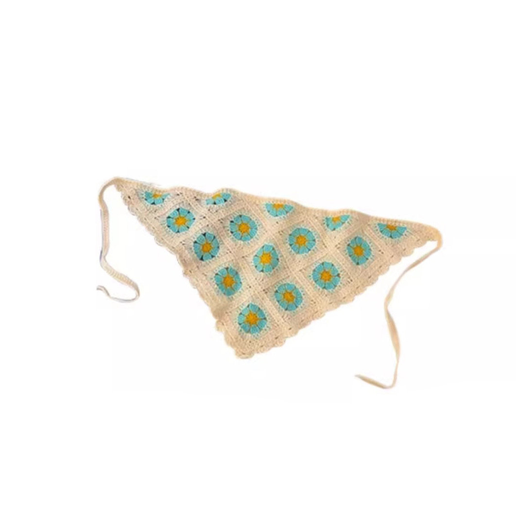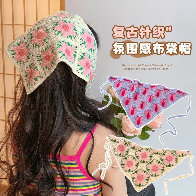法式头巾女秋冬高级感蕾丝钩花发带海边多巴胺森系针织三角巾头饰