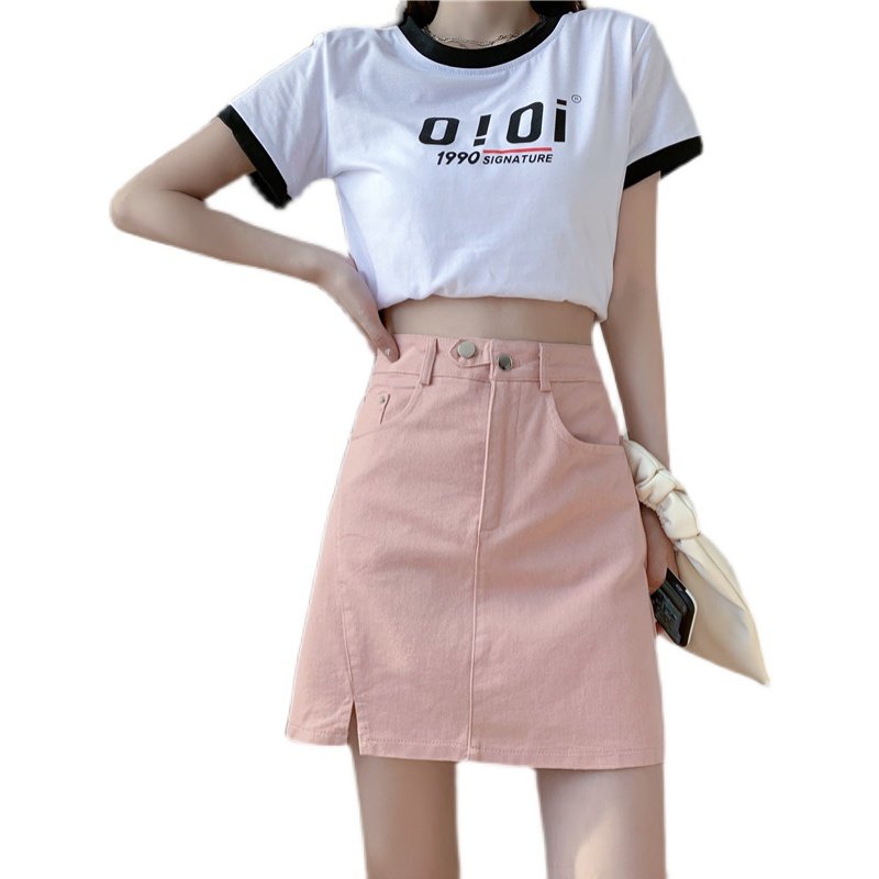 粉色牛仔裙女夏薄2022新款半身裙高腰a字裙胖mm显瘦大码包臀短裙