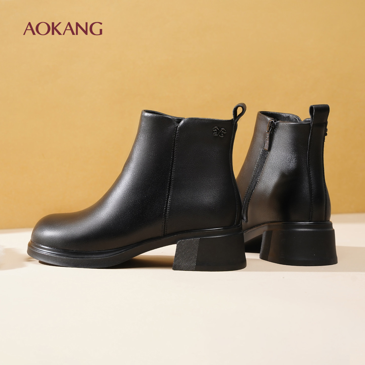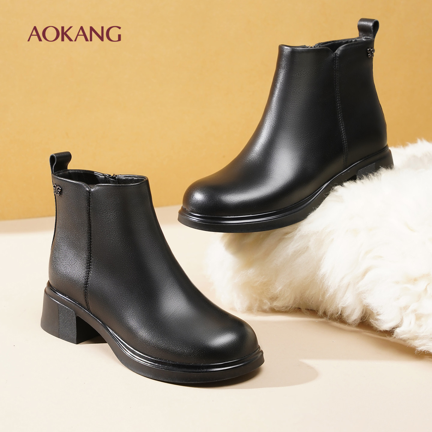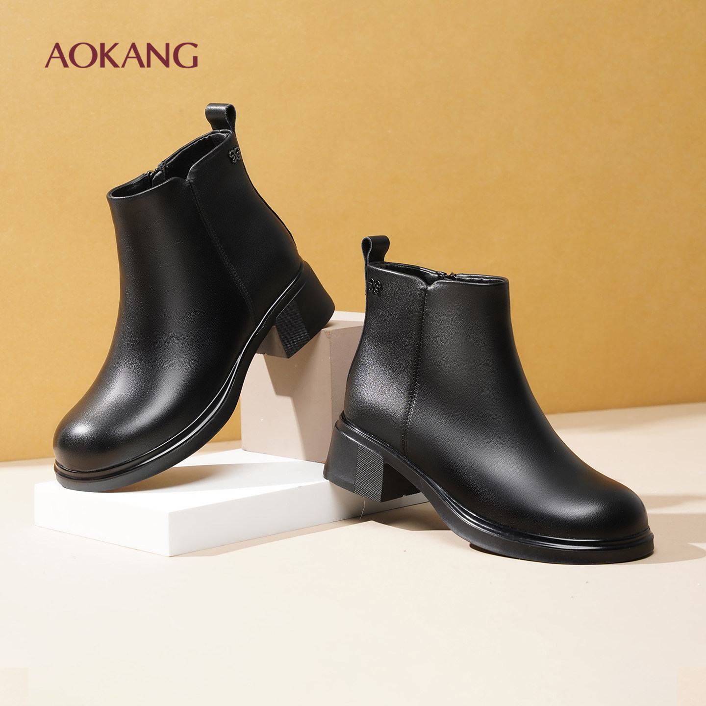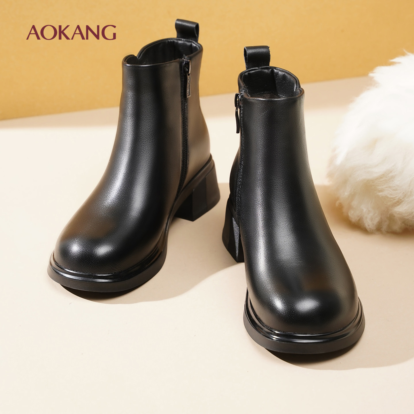 奥康 女鞋秋冬季新款加绒保暖真皮粗跟短靴侧拉链瘦瘦靴切尔西靴L