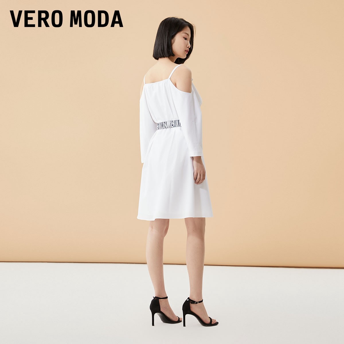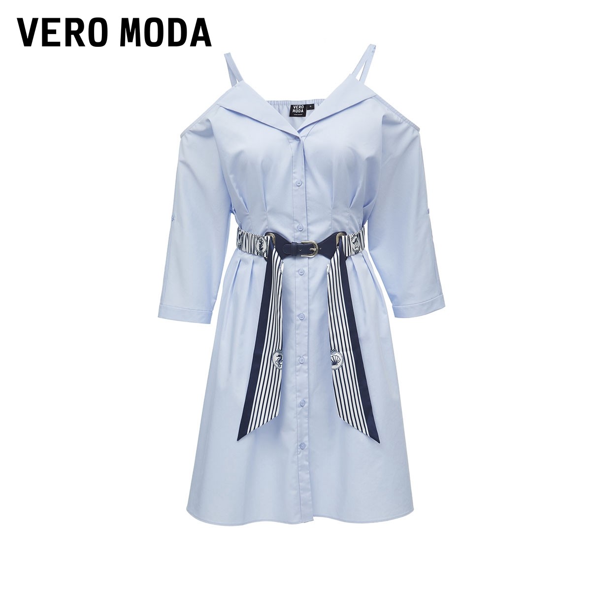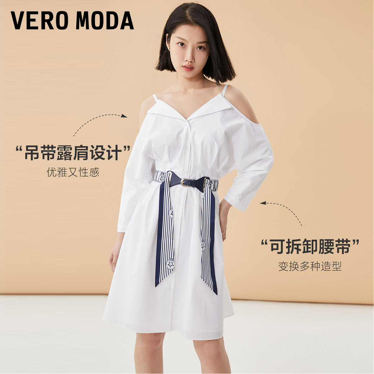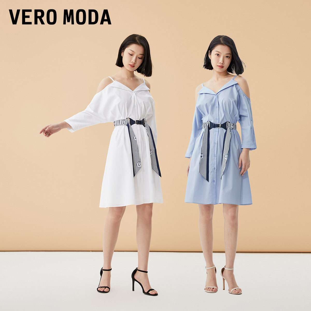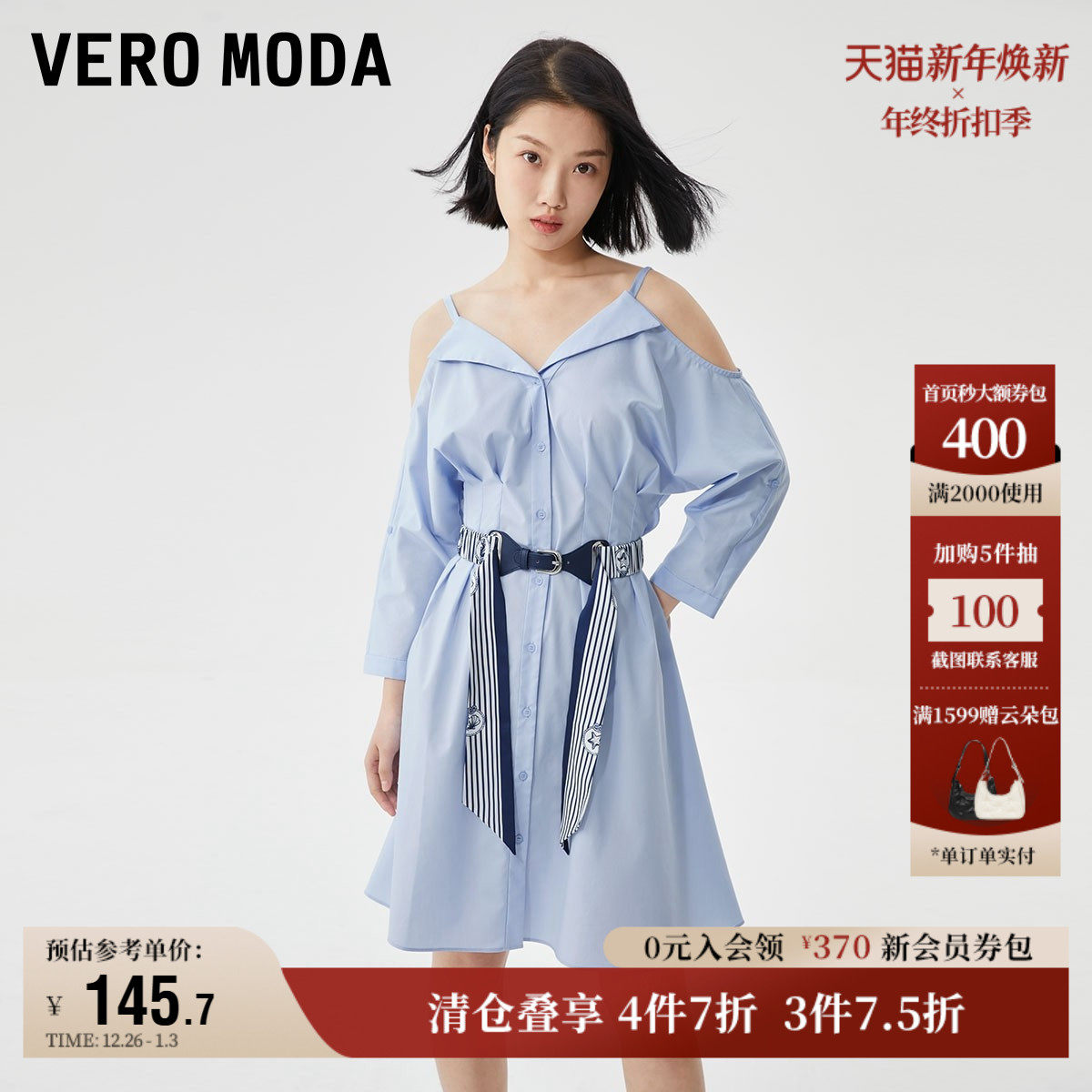 Vero Moda奥莱衬衫式连衣裙子秋季清仓V领露肩收腰七分袖休闲女