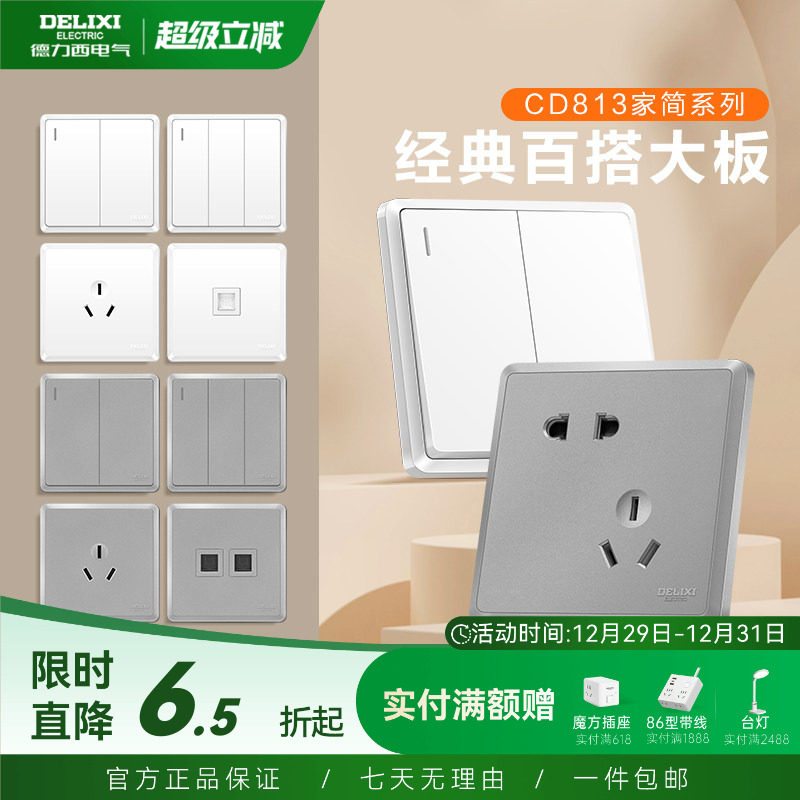 德力西开关插座旗舰店86型暗装面板五孔双控16A墙壁插座家用813白