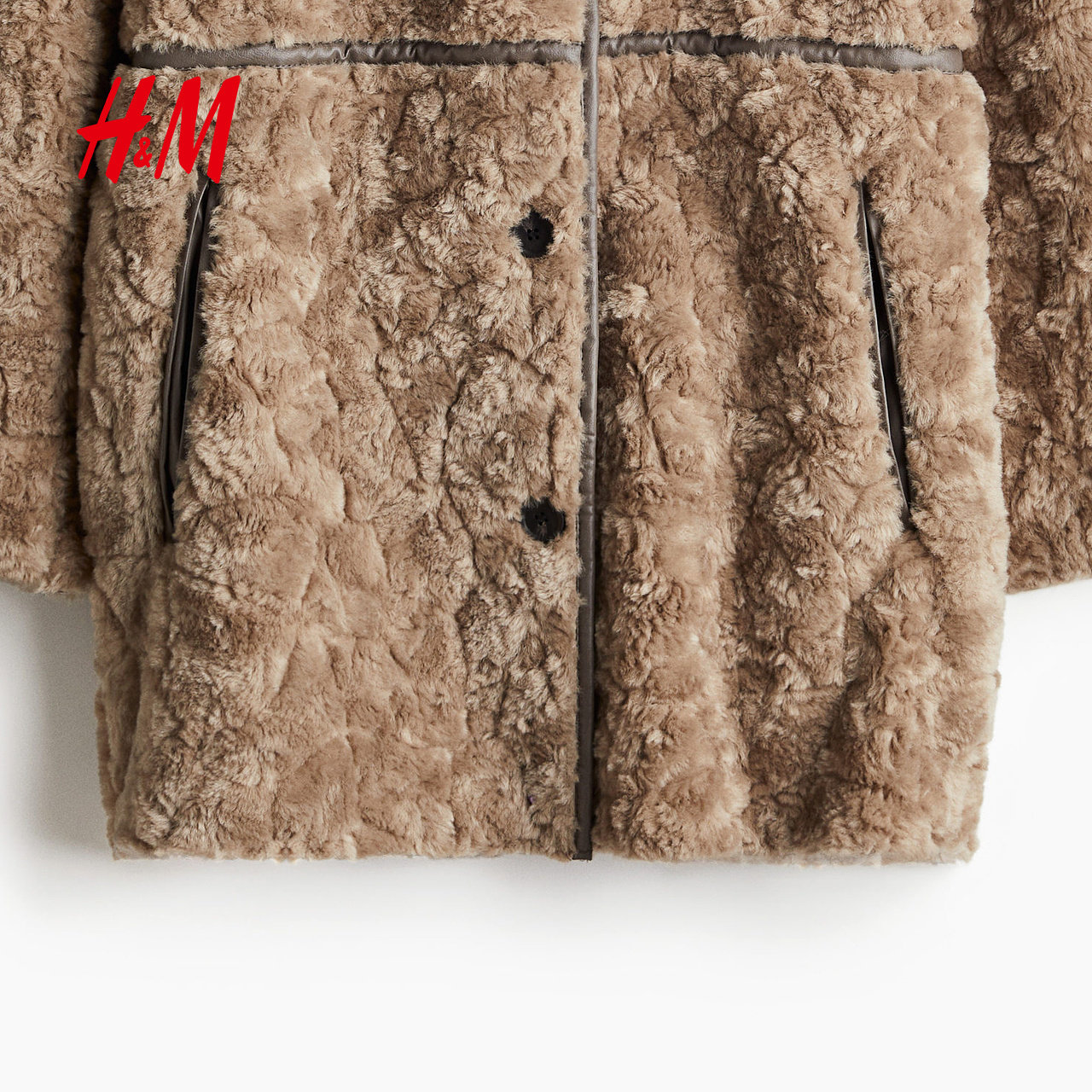 HM女装毛呢外套冬季立领宽松毛茸宽松附侧唇袋短大衣1248383