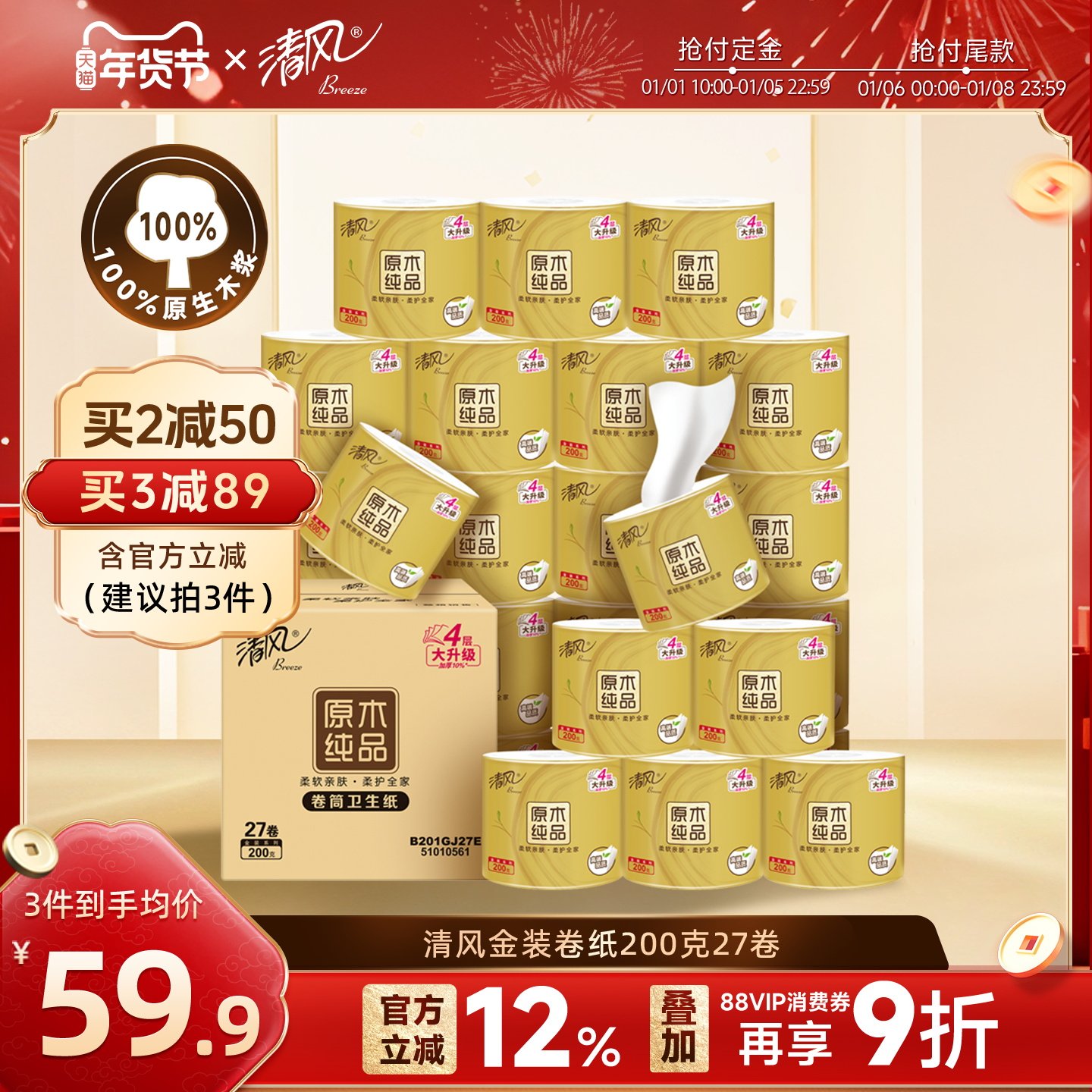 【直播间补贴价】清风卷纸金装4层200克27卷厕纸家用卷筒纸实惠装