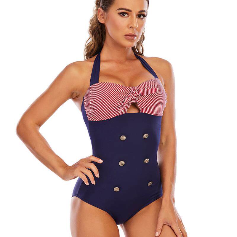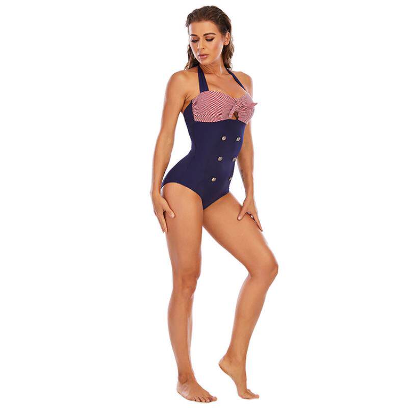 亚马逊跨境大码条纹复古游泳衣欧美外贸三角连体泳装女