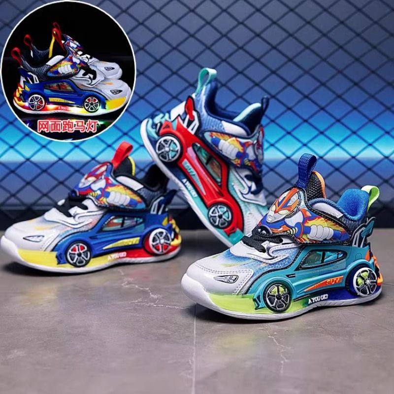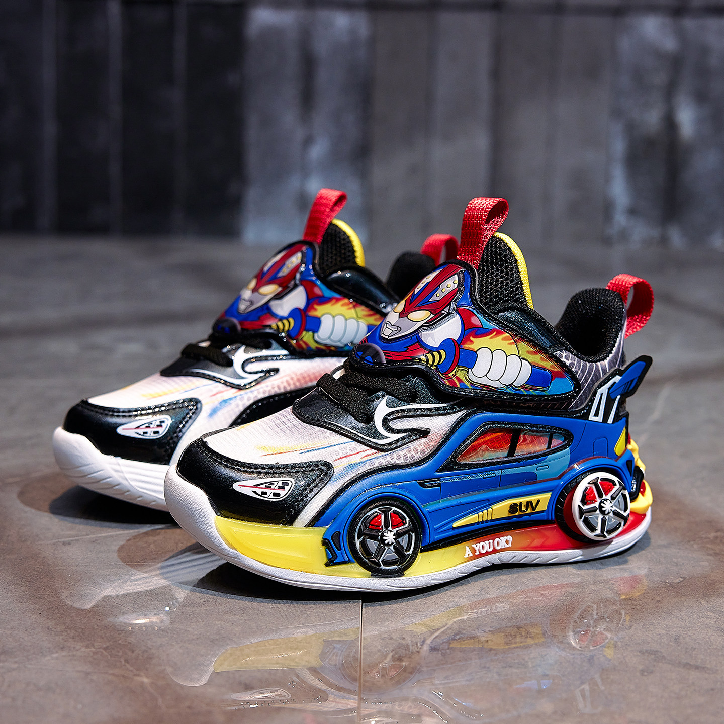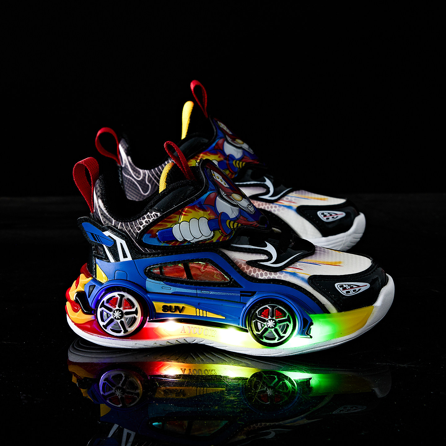 巴布豆真皮鞋子男童2025新款冬季加绒保暖儿童皮面亮灯运动鞋发光