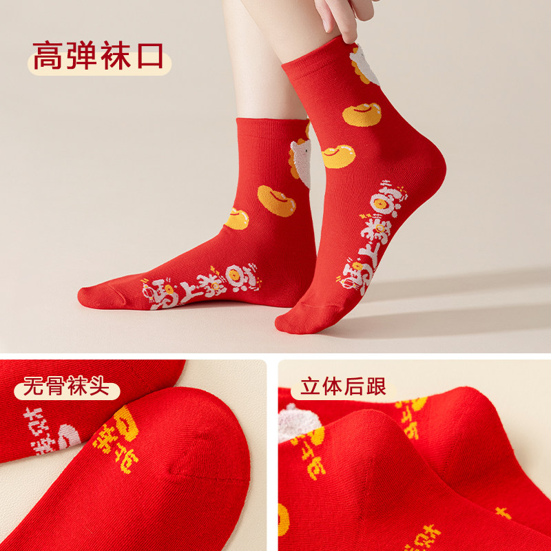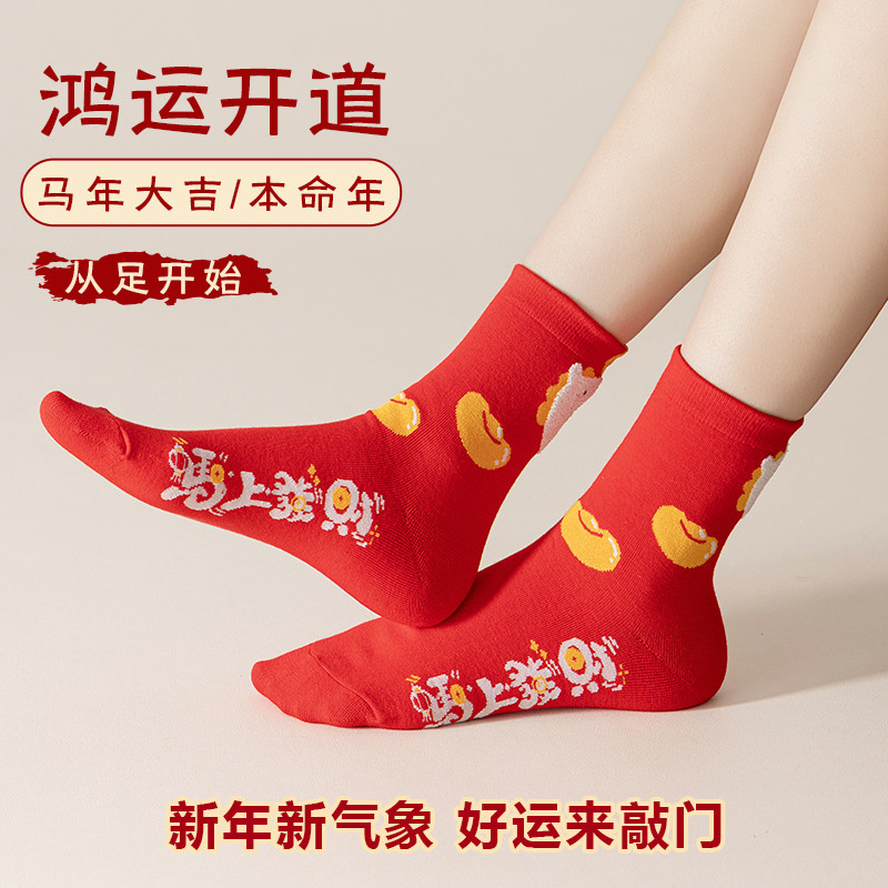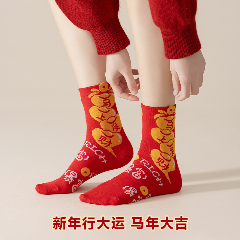 暴富好运马年本命年红袜子女冬季中筒袜可爱2026属马情侣新年长袜