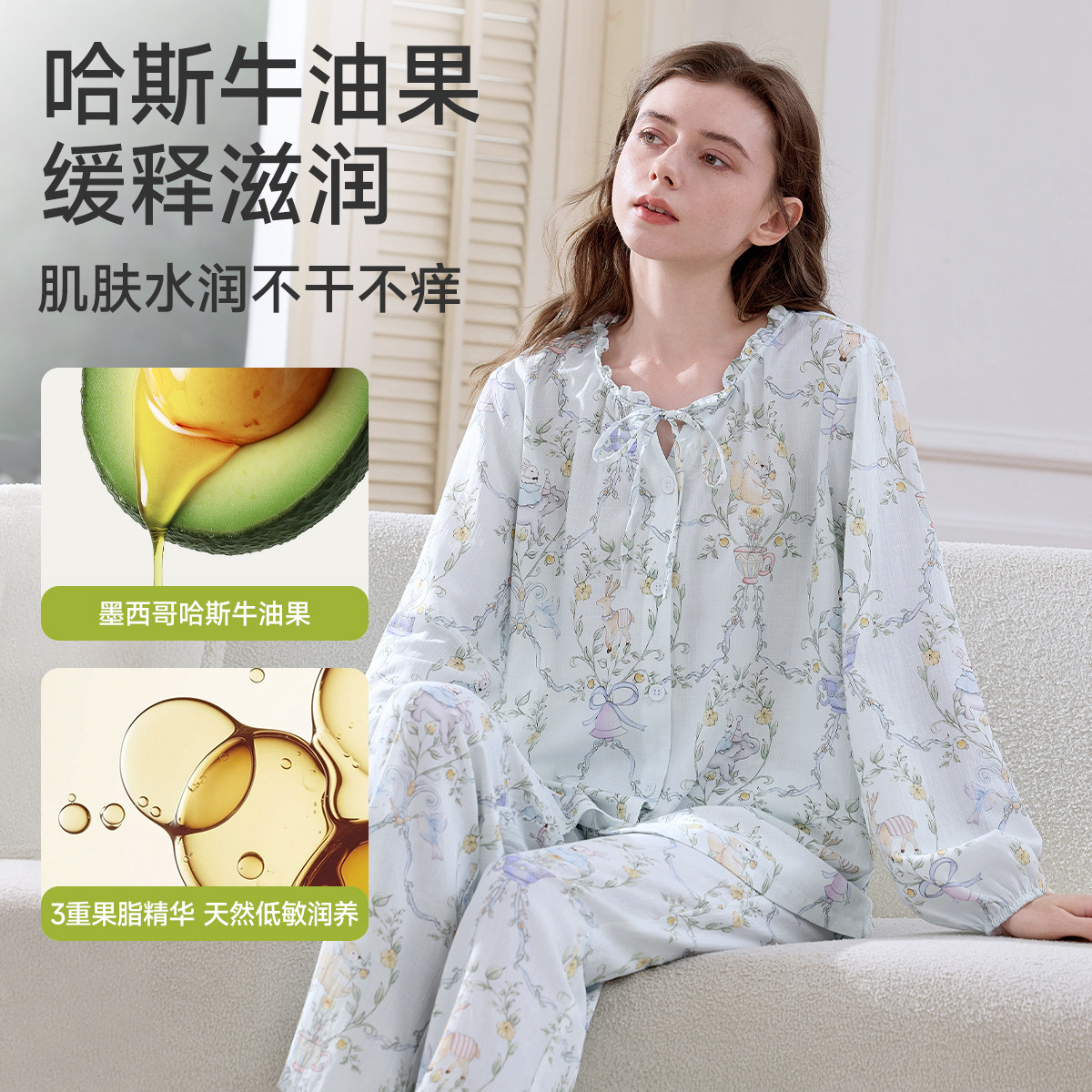 婧麒牛油果纱罗月子服夏薄款产后孕妇睡衣孕期哺乳透气家居服套装