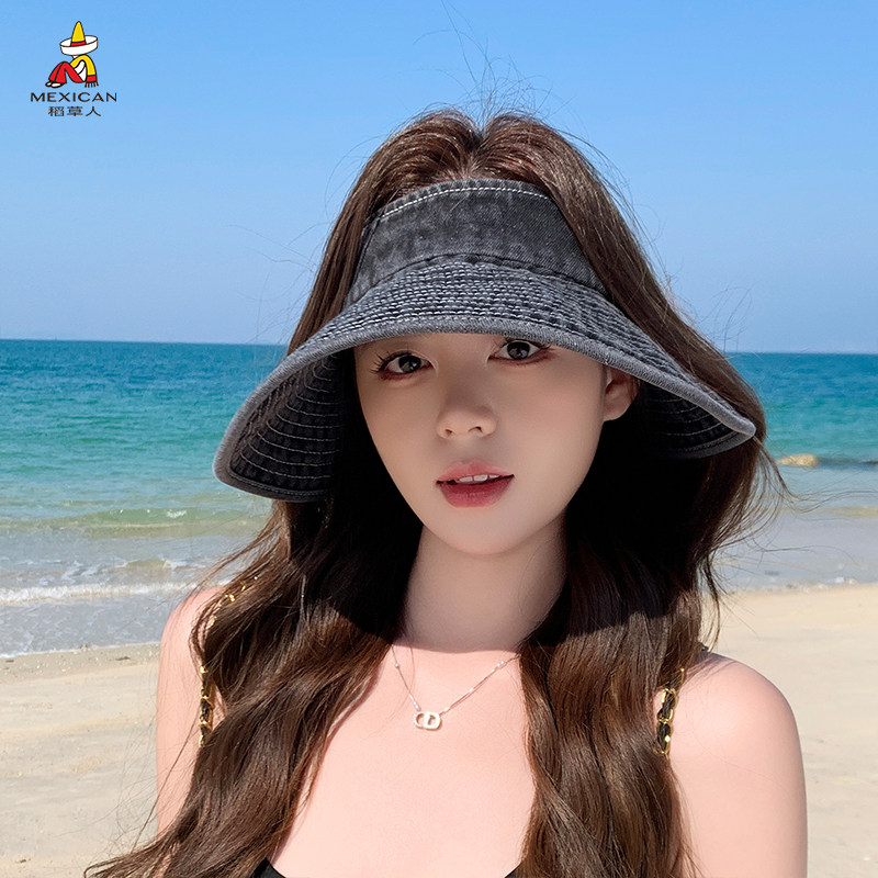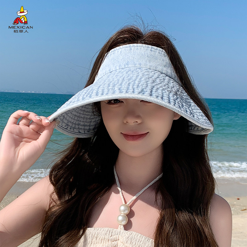 稻草人新款牛仔空顶帽女夏季防晒大帽檐遮阳太阳帽可折叠度假帽子