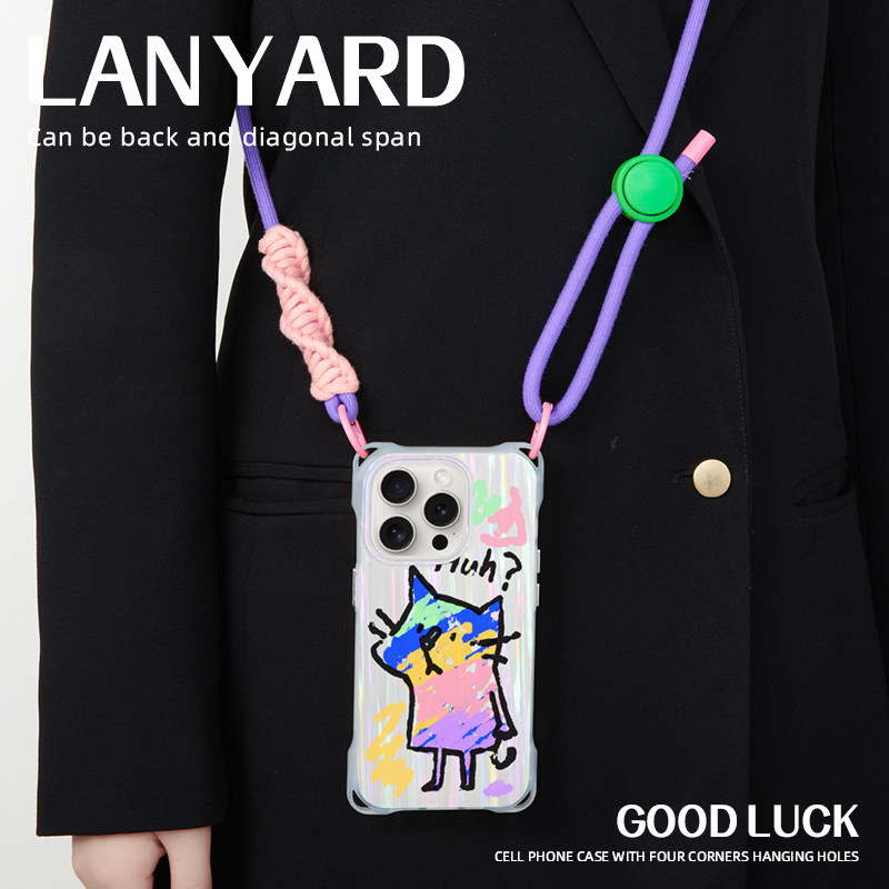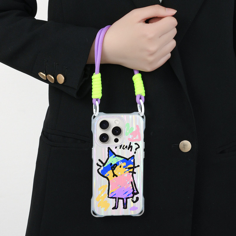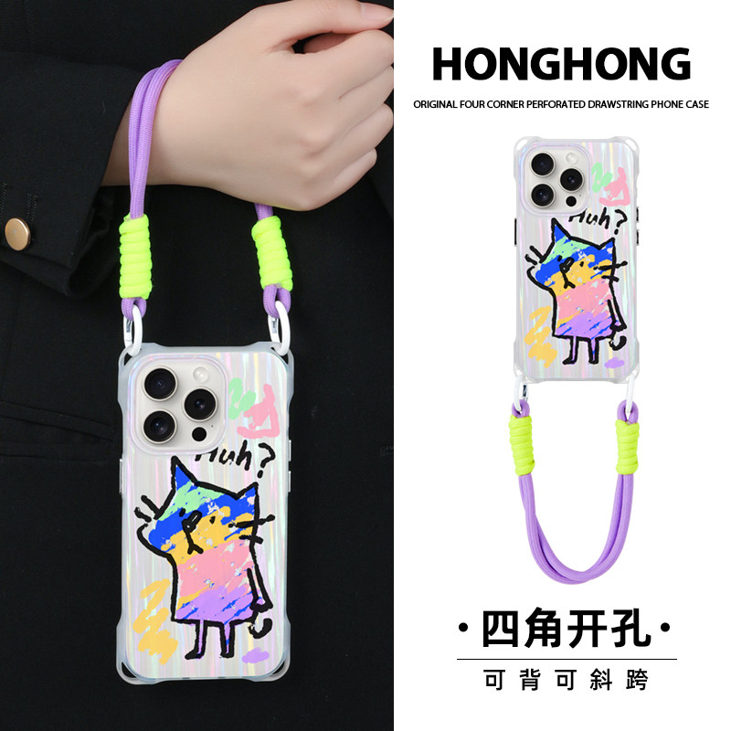 适用iphone16promax手机壳创意涂鸦猫苹果17磁吸华为mate60斜跨可背新款p80紫色带挂绳小米15挂脖背带手提14