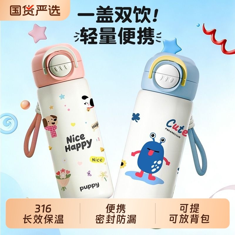 儿童保温杯男生双饮水杯2026新款吸管杯子女孩小学生上学专用水壶