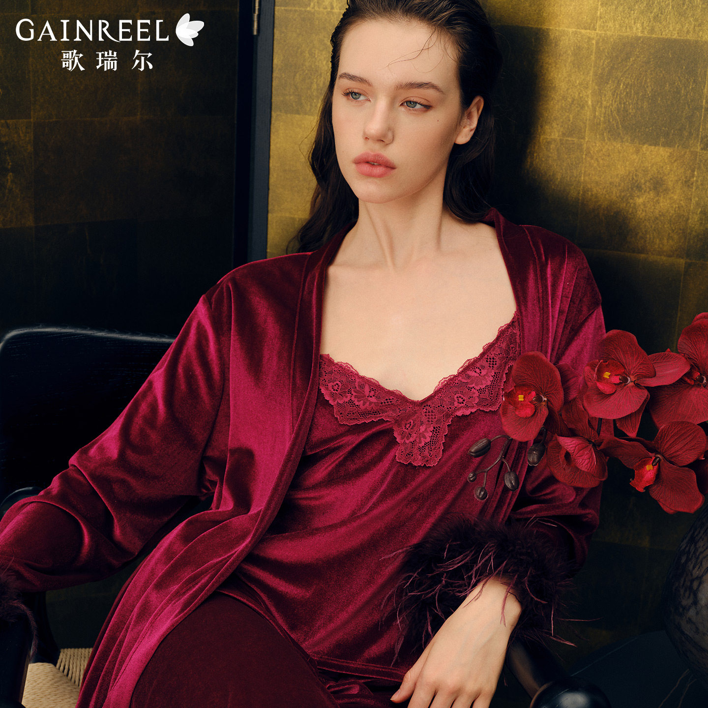 歌瑞尔睡衣女春秋外穿三件套丝绒睡袍吊带背心红色家居服鸵鸟羽毛