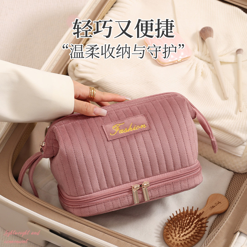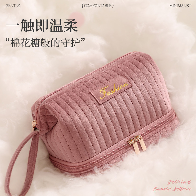 双层化妆包大容量收纳包高颜值荷兰绒便携出行化妆手提包女洗漱包