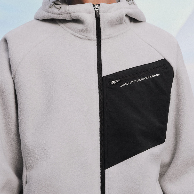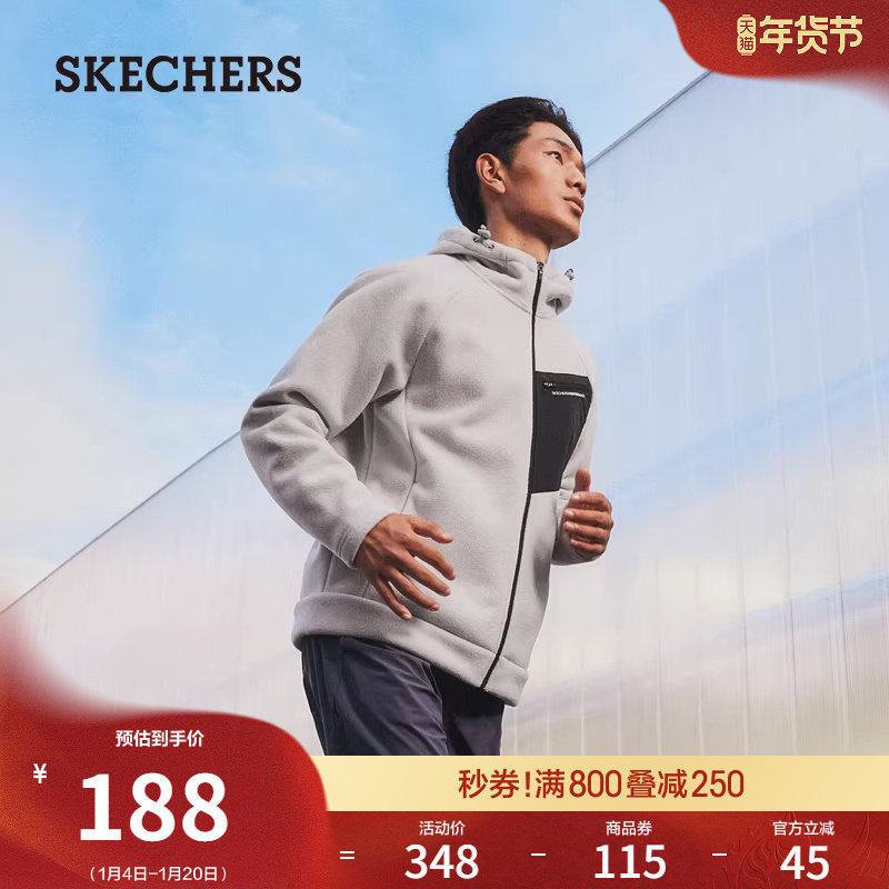 斯凯奇冬季男士摇粒绒保暖连帽外套夹克撞色运动上衣加绒柔软夹克