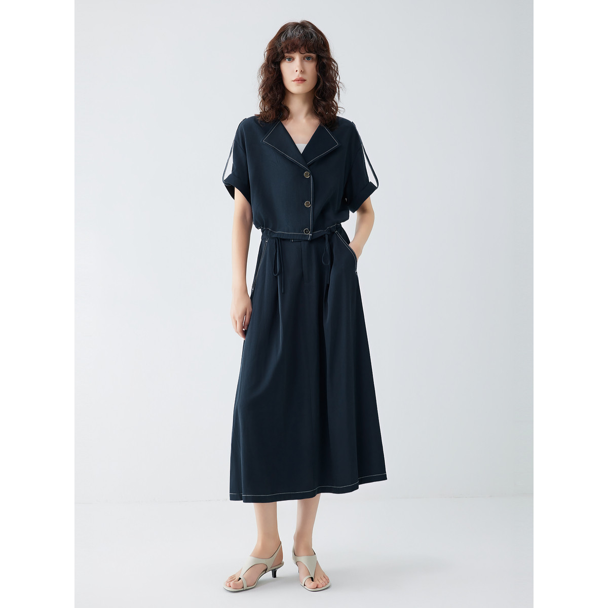 ELLE法式通勤风亚麻连衣裙女2025秋季新款收腰显瘦设计感a字裙子