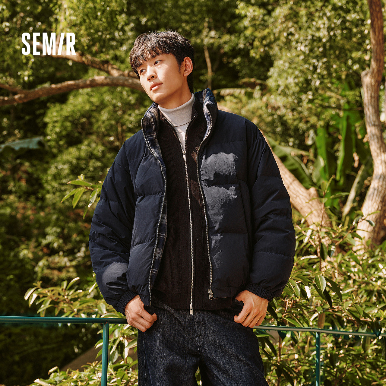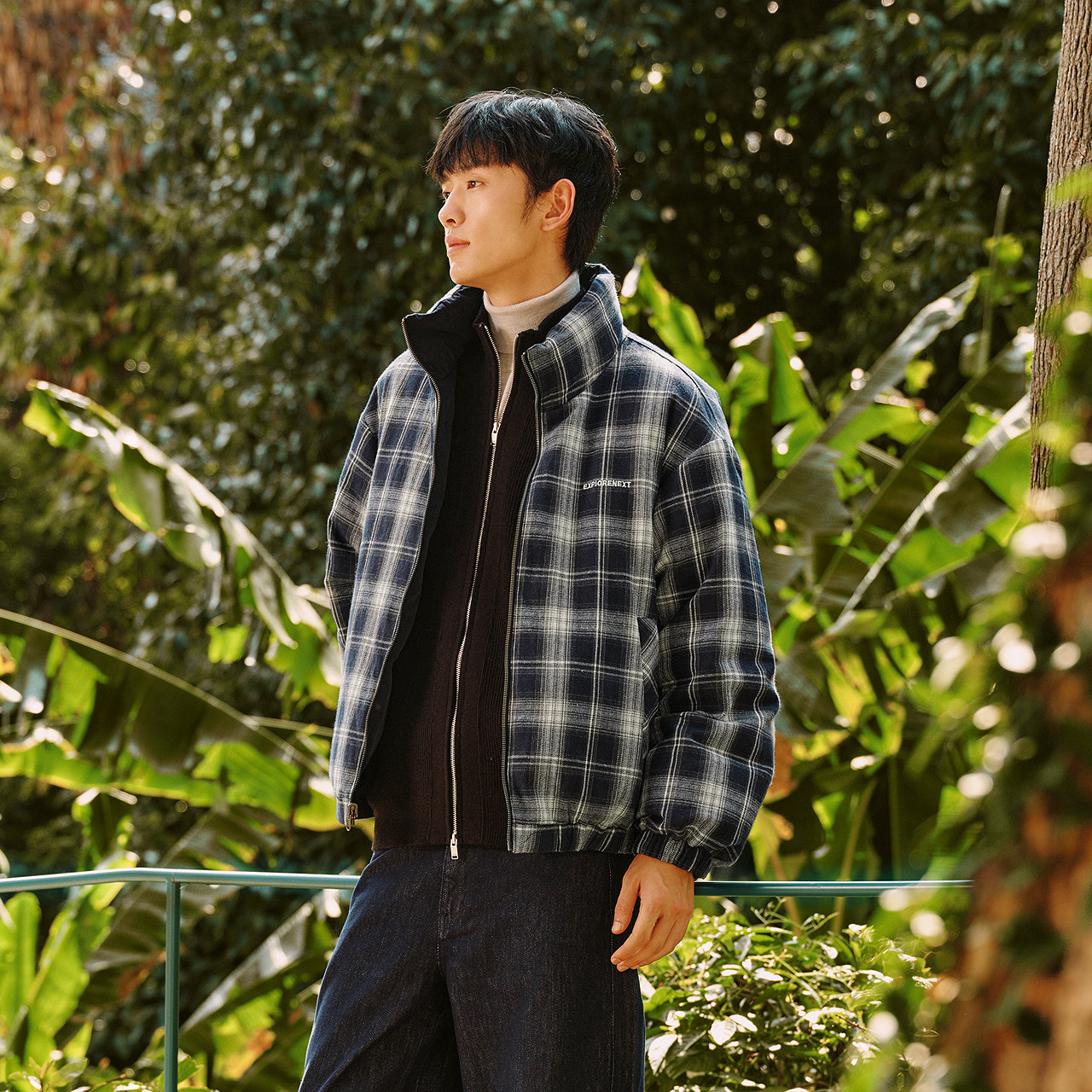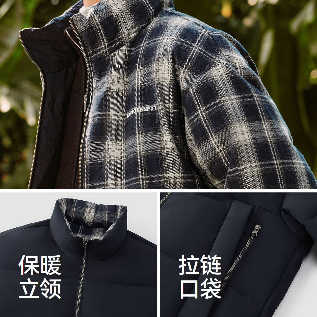 森马羽绒服男冬装80绒子双面穿外套2025新款复古格纹学院立领上衣
