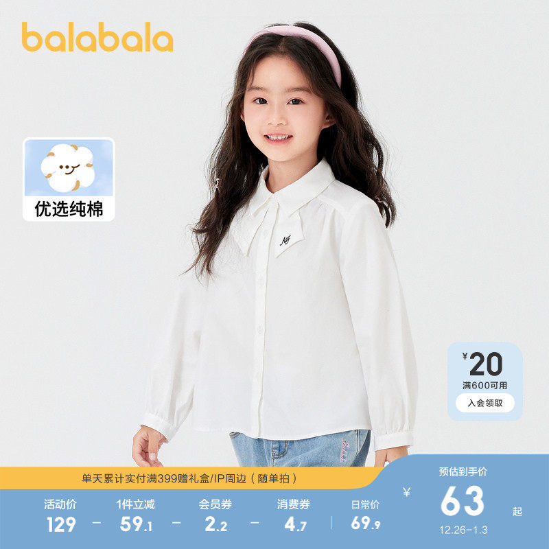 巴拉巴拉童装儿童长袖衬衫女童秋装纯棉白衬衣2025新款中大童