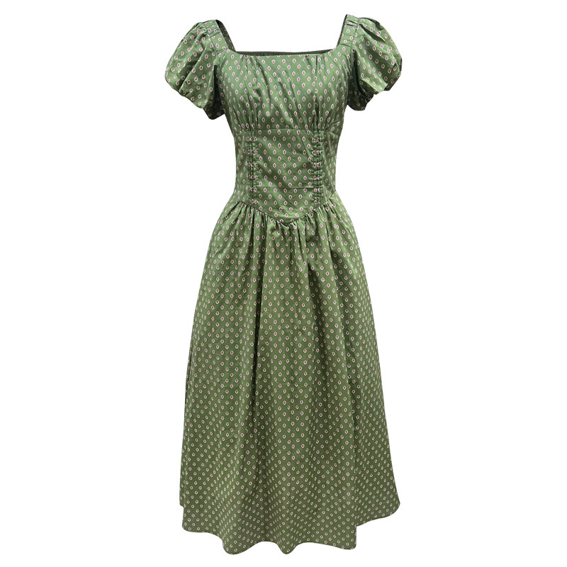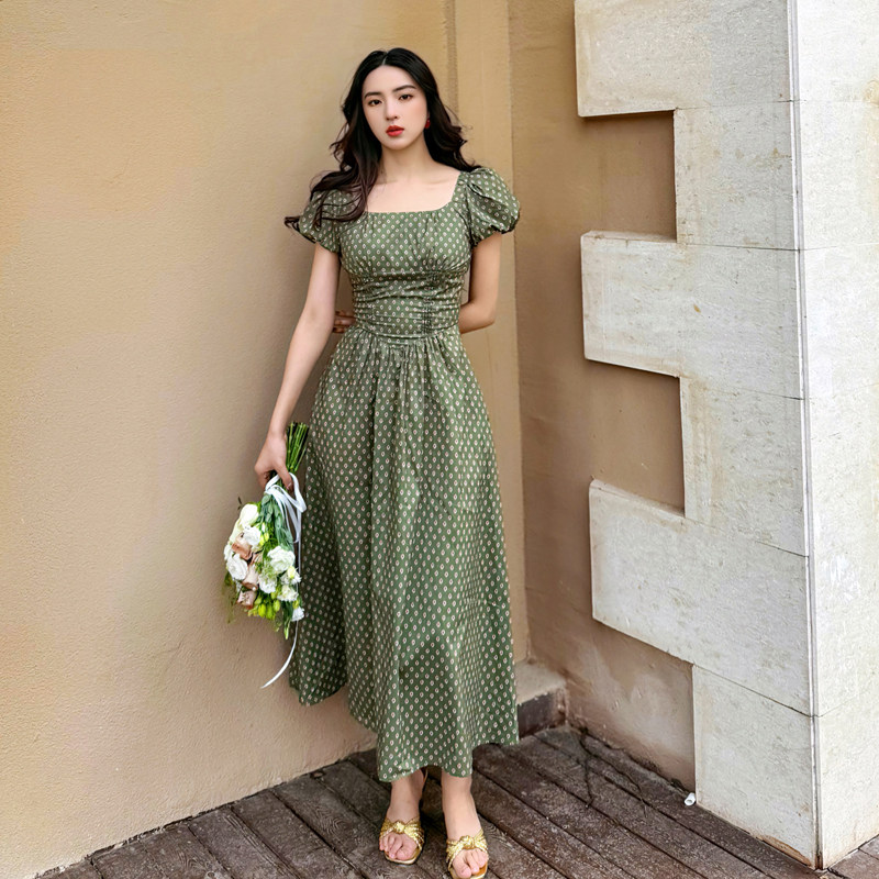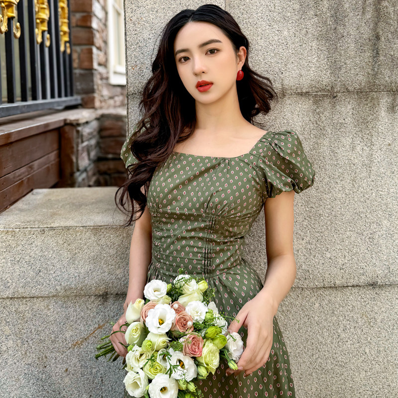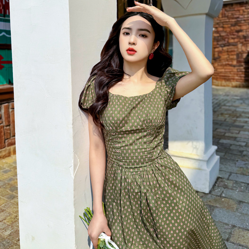 法式复古森系碎花连衣裙设计感气质方领泡泡袖中长裙子显瘦女夏季