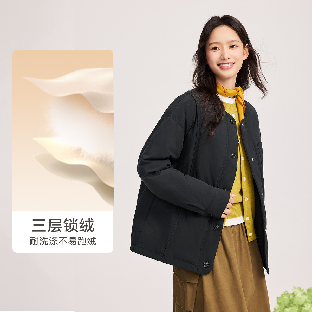 拉夏贝尔2025轻薄羽绒服女短款冬季韩版修身圆领无领内胆保暖外套