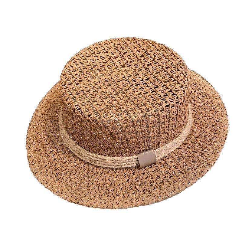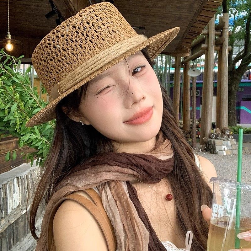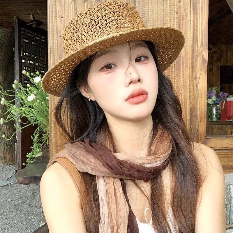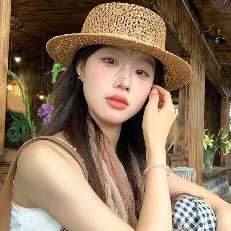 新款镂空编织平顶草帽女春夏季法式海边沙滩复古遮阳防晒帽太阳帽