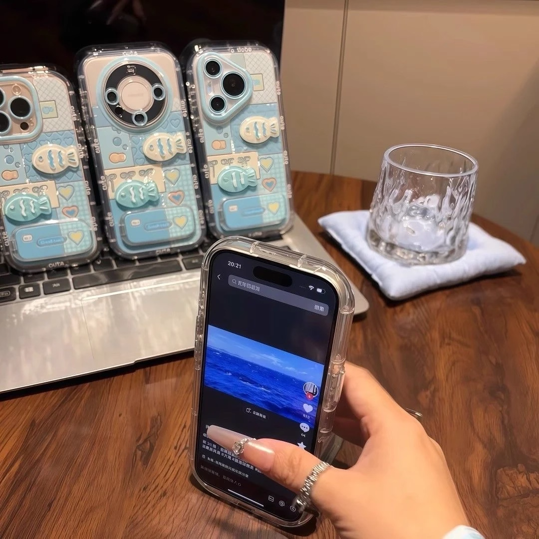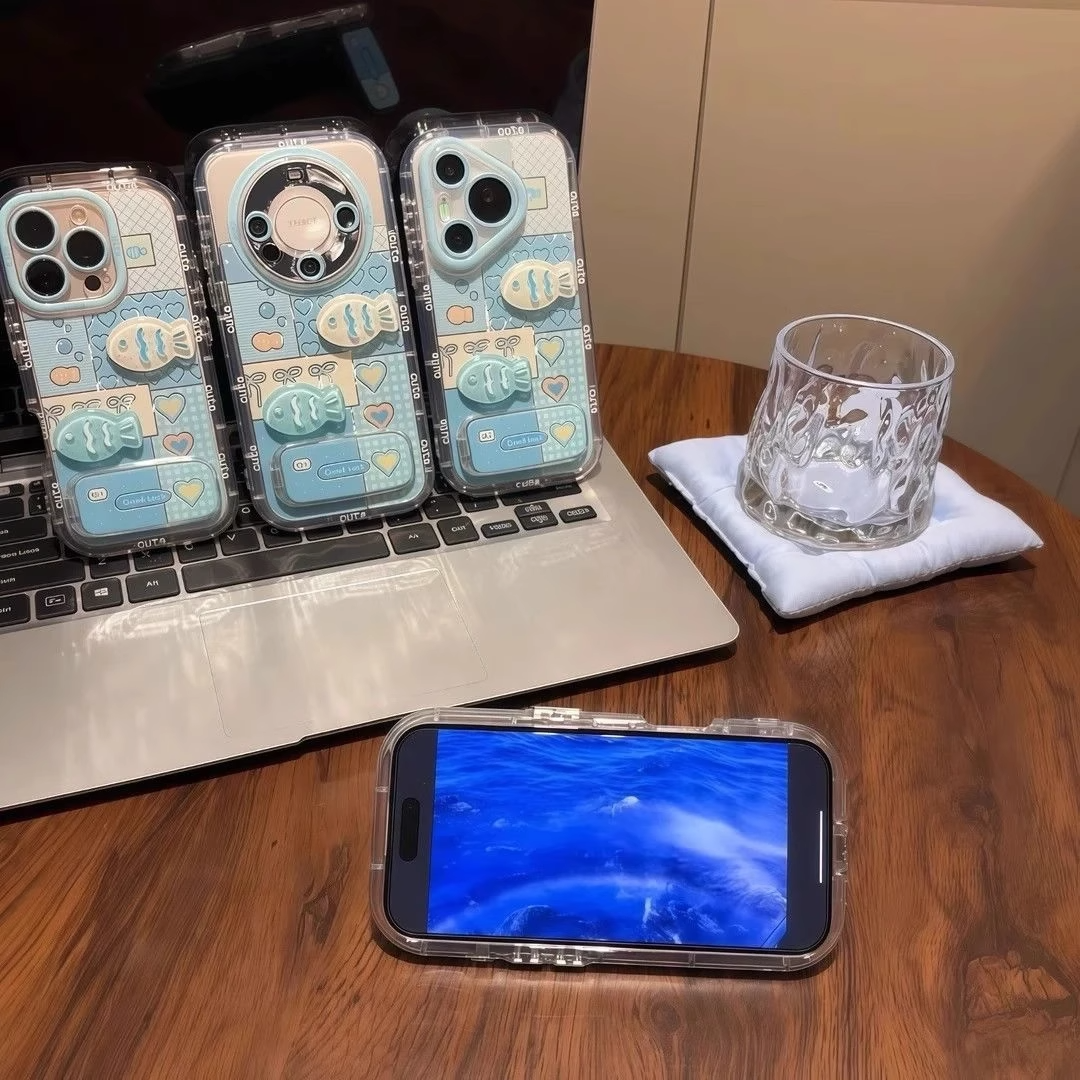 蓝格小鱼镜子支架适用于苹果16promax手机壳iphone15/14/13/12/11华为mate70pro新款pura80防摔小米vivoppo女