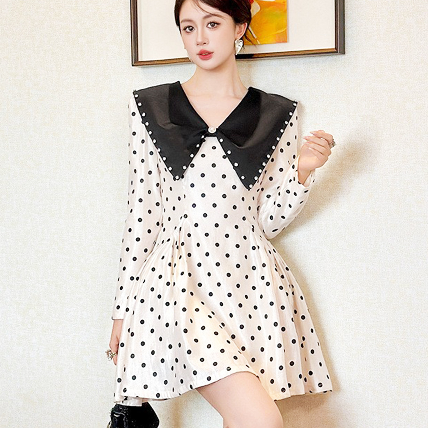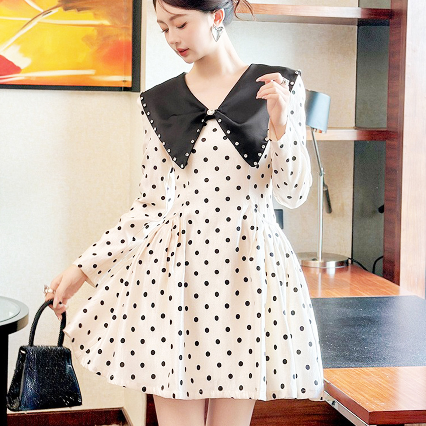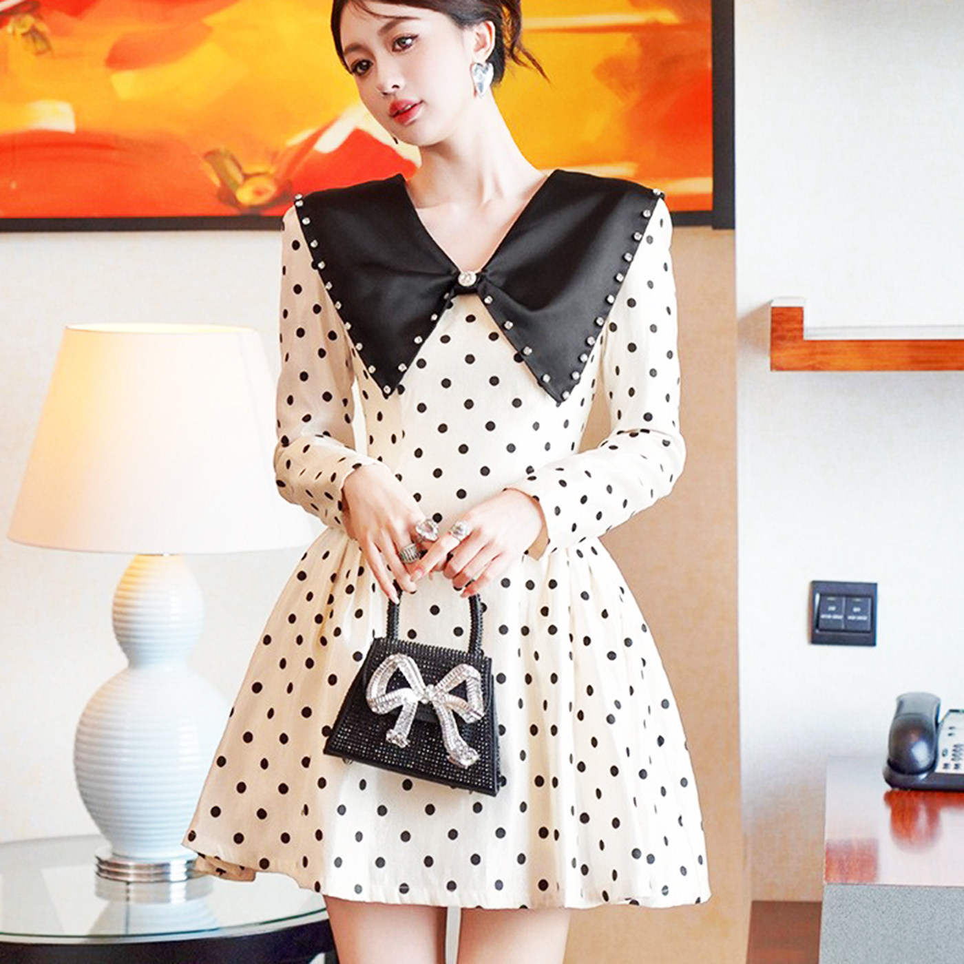 一三良品小个子 南法假日 复古显瘦深蓝波点蕾丝拼接连衣裙长裙