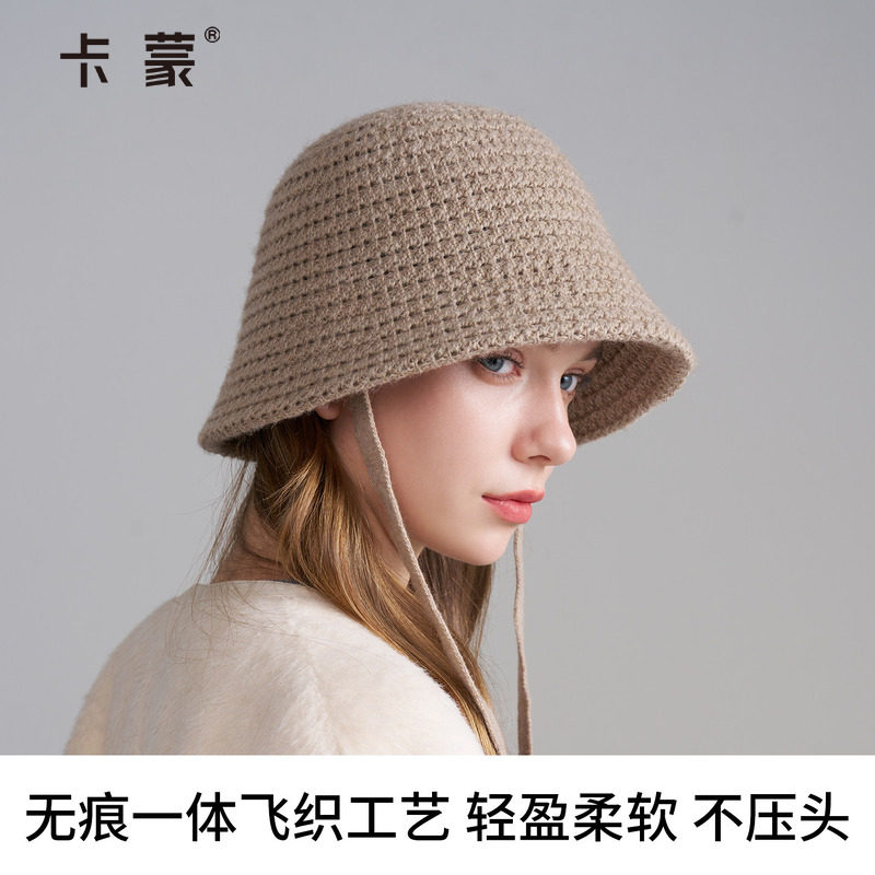 卡蒙针织渔夫帽女秋冬护耳系带水桶帽子可折叠保暖盆帽显脸小百搭