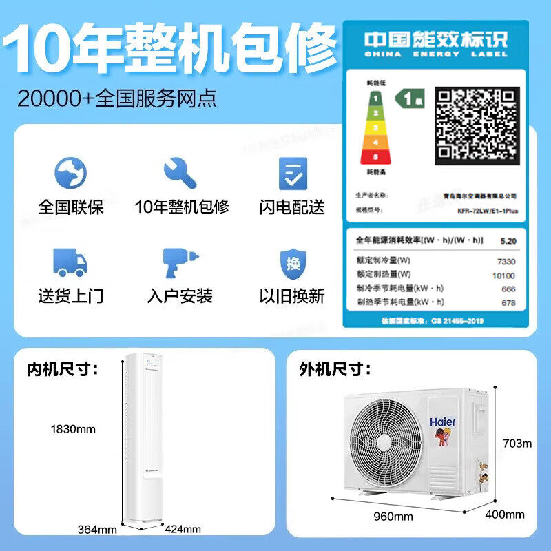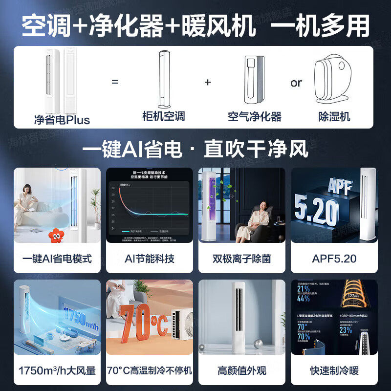 海尔净省电Plus3匹空调家用一级能效客厅卧室冷暖两用立式柜机