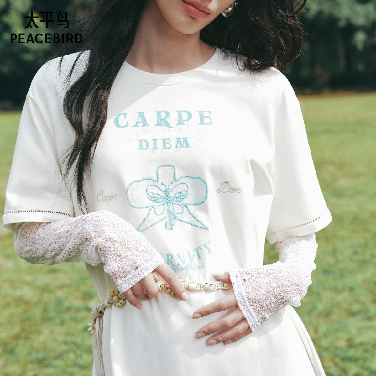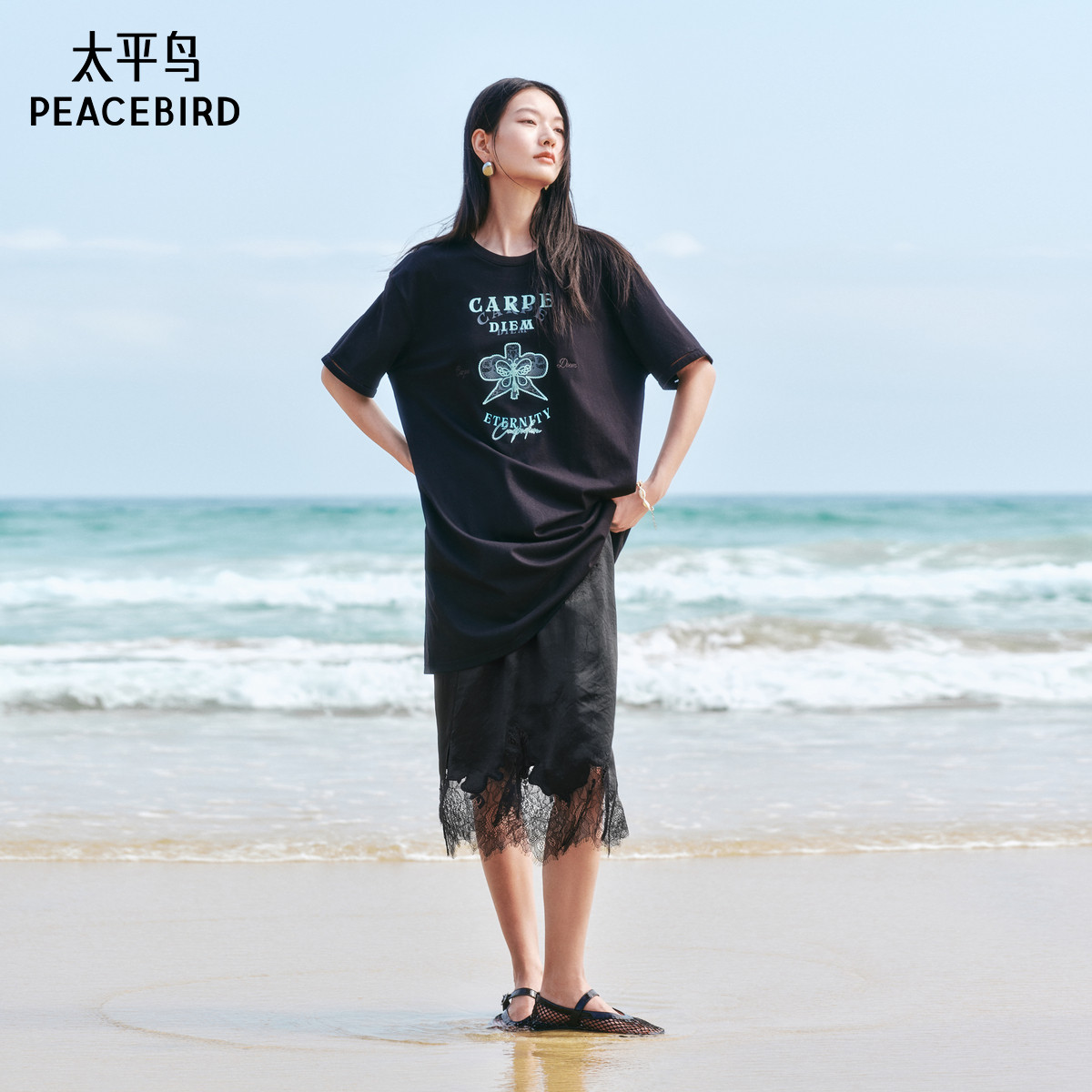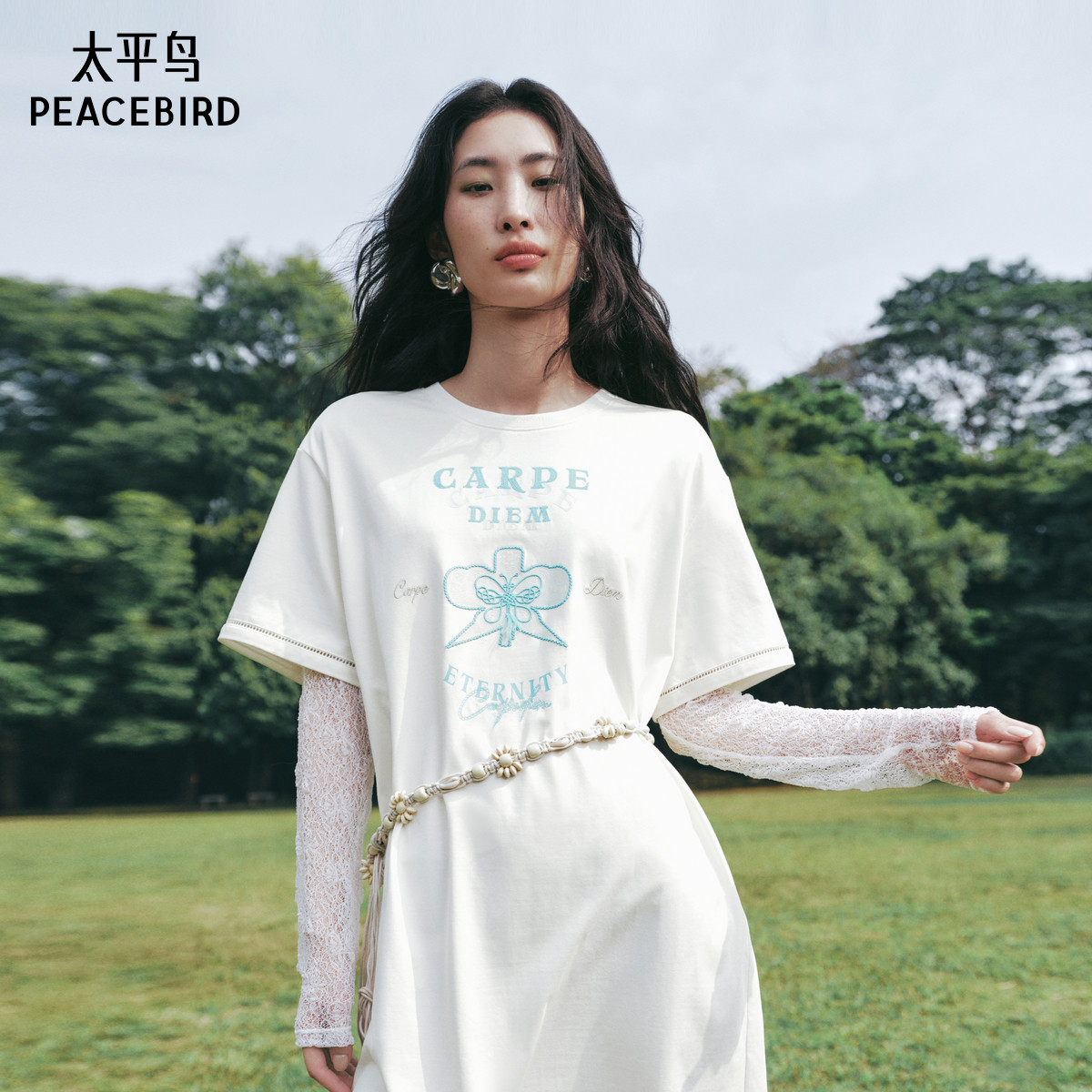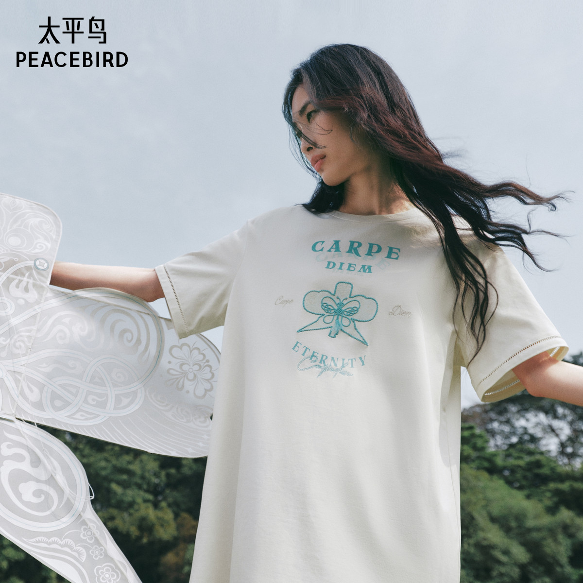 张风野联名 太平鸟T恤连衣裙女2025夏新款风筝印花撞色宽松短裙潮