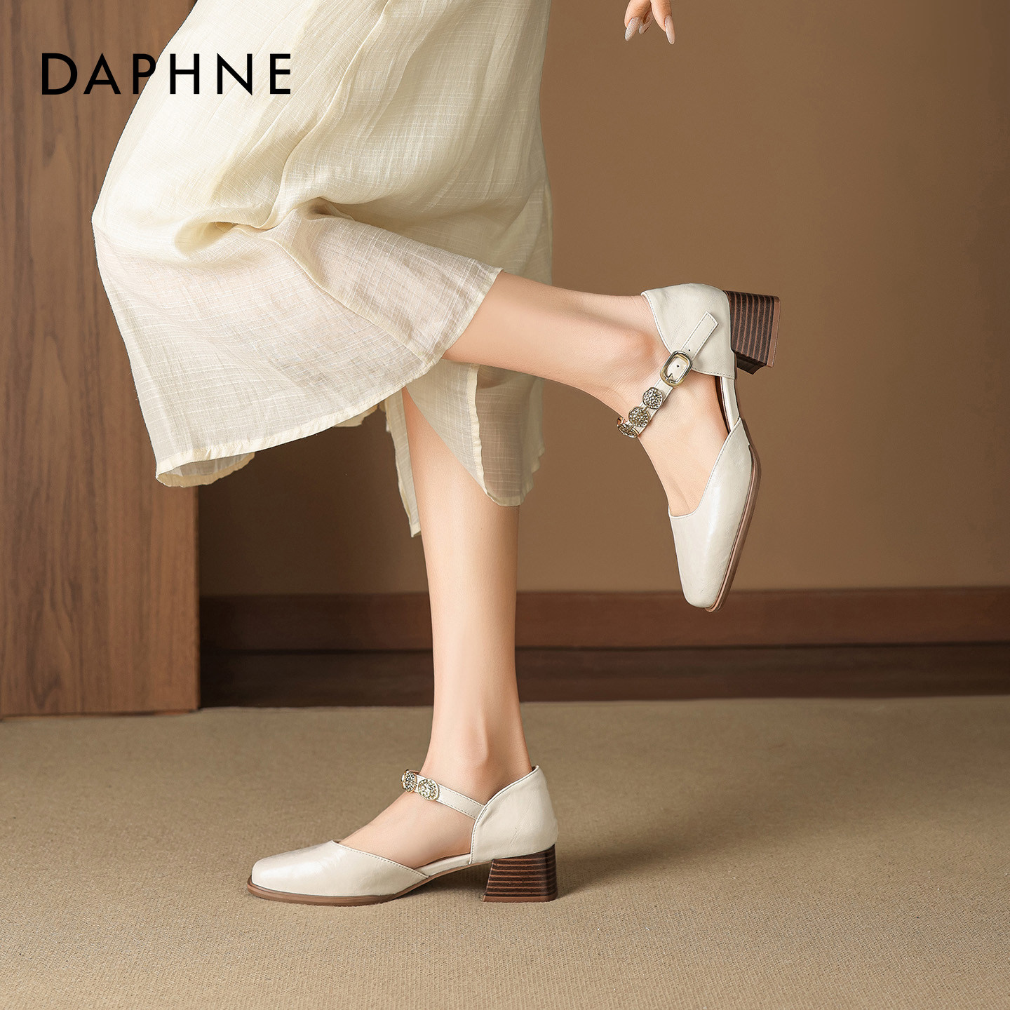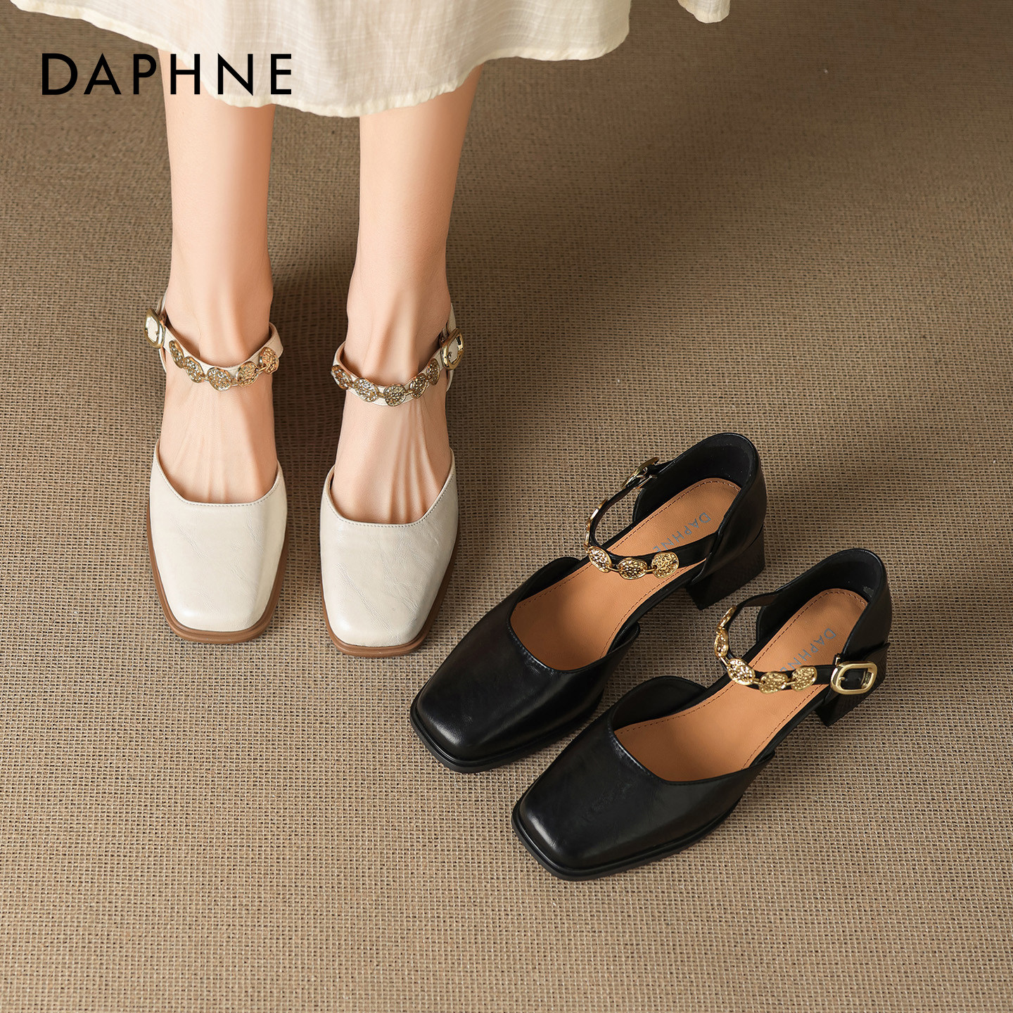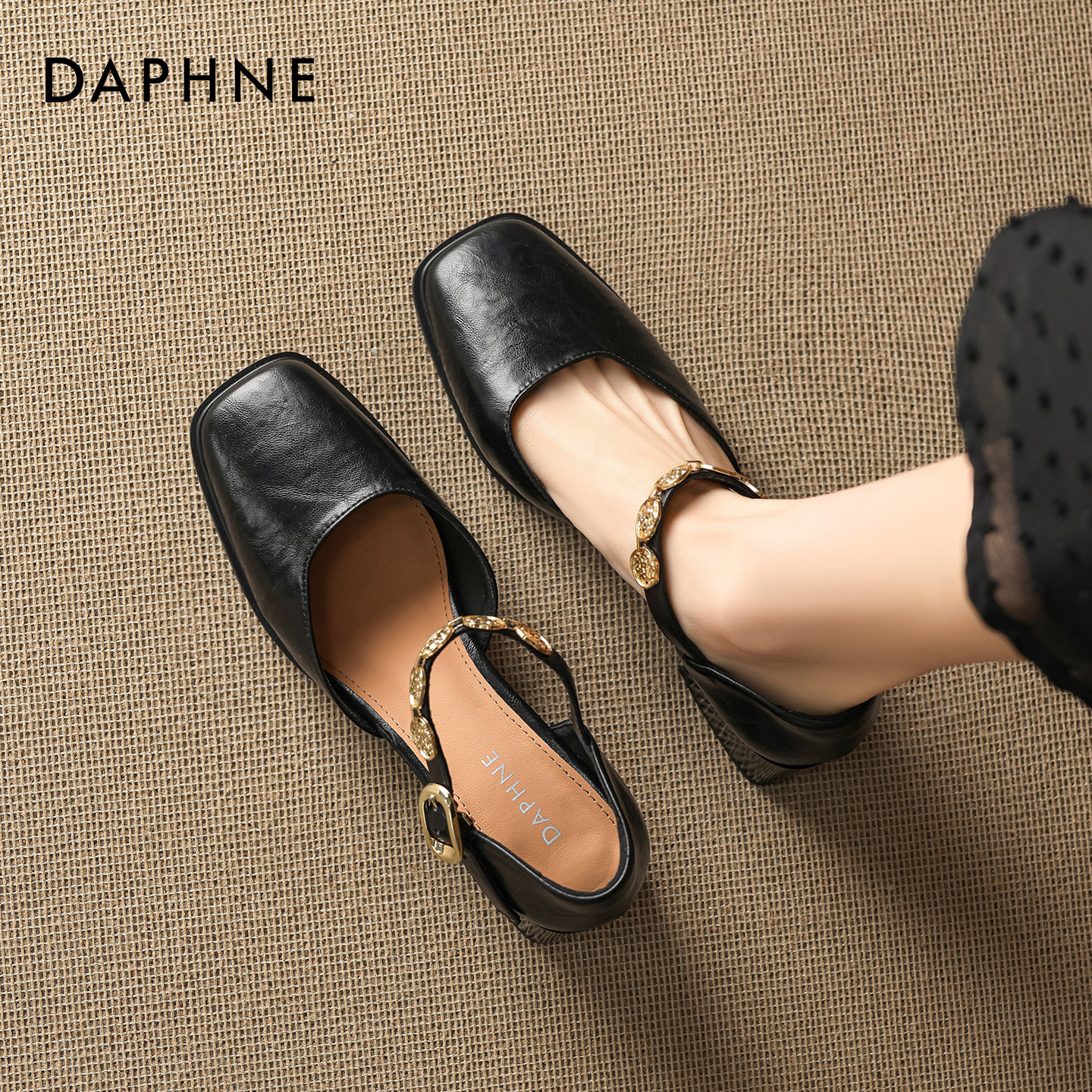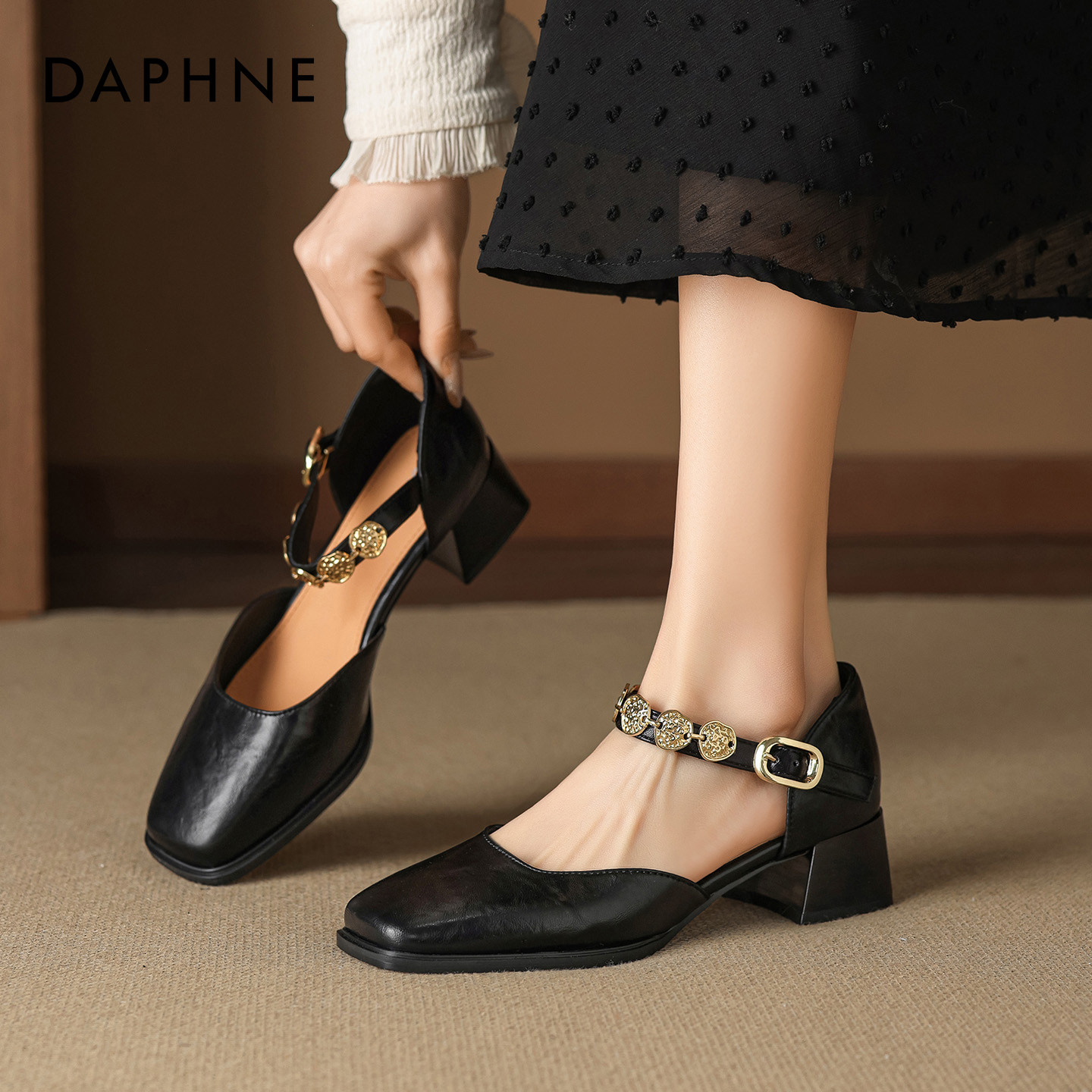 达芙妮黑色凉鞋女2026新款春季中跟粗跟一字带配裙子方头玛丽珍鞋
