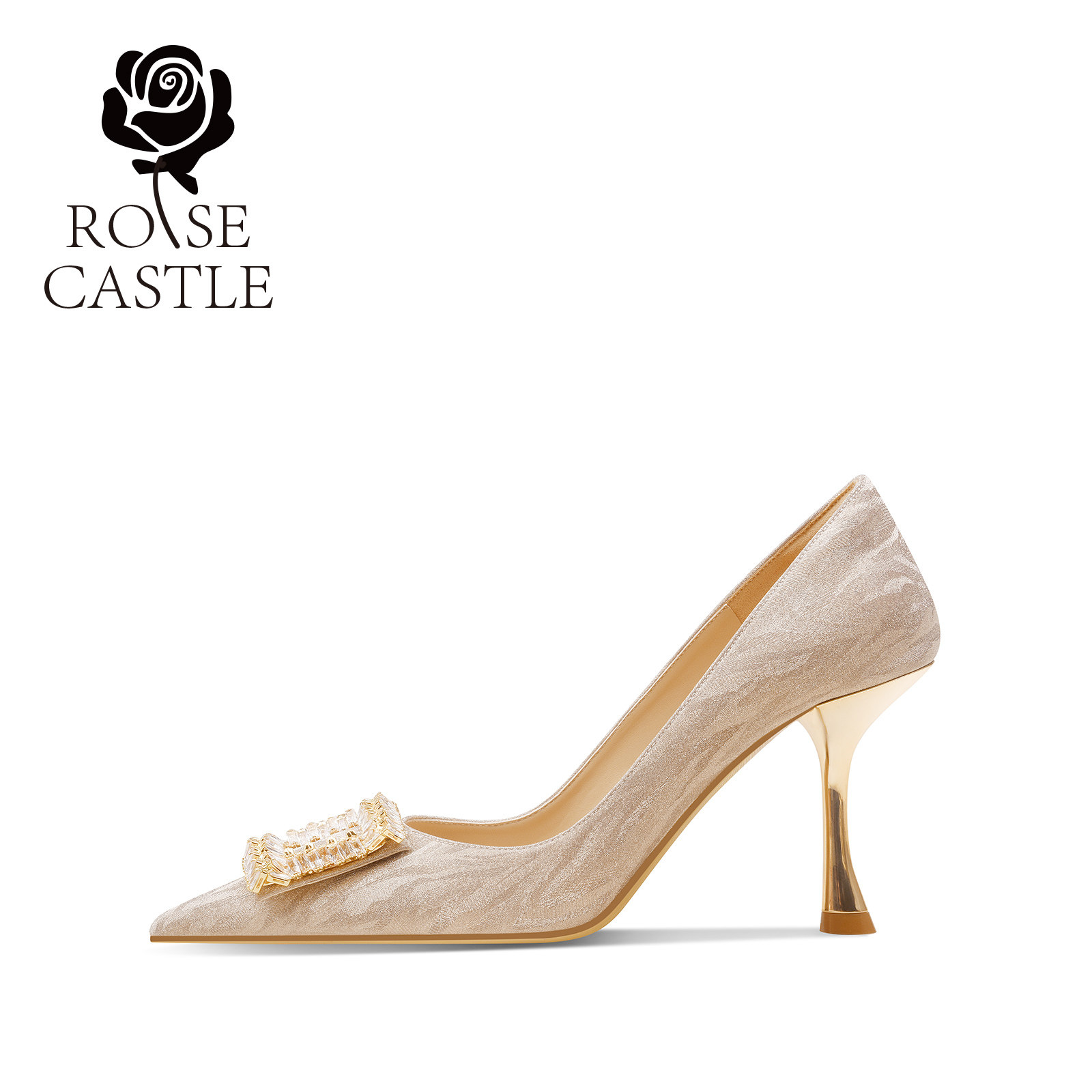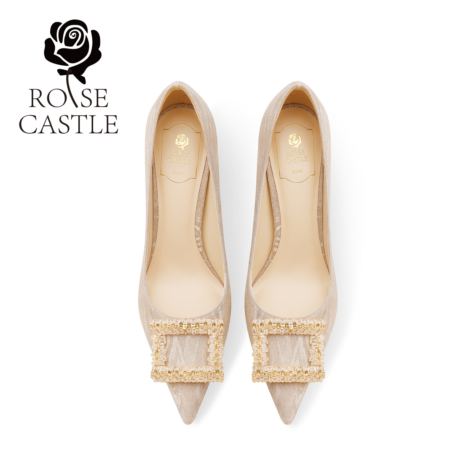 rosecastle金色方扣水晶婚鞋女新娘鞋伴娘高跟鞋秀禾婚纱两穿单鞋