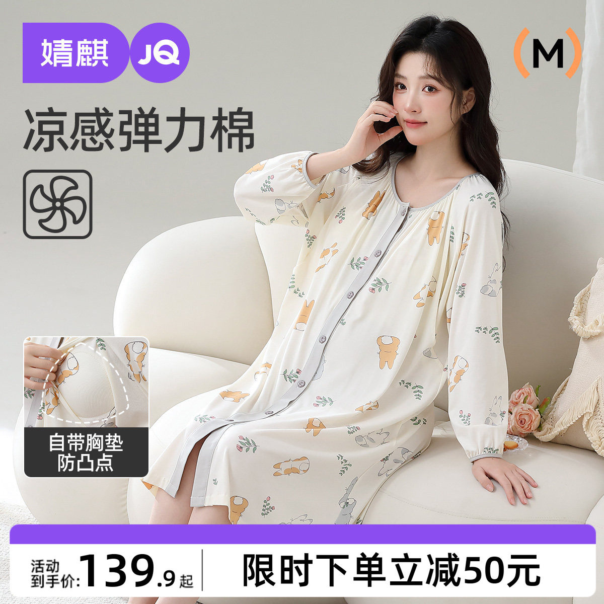 婧麒送胸垫孕妇待产裙夏季凉感纯哺乳睡裙睡衣棉产后产妇月子服女