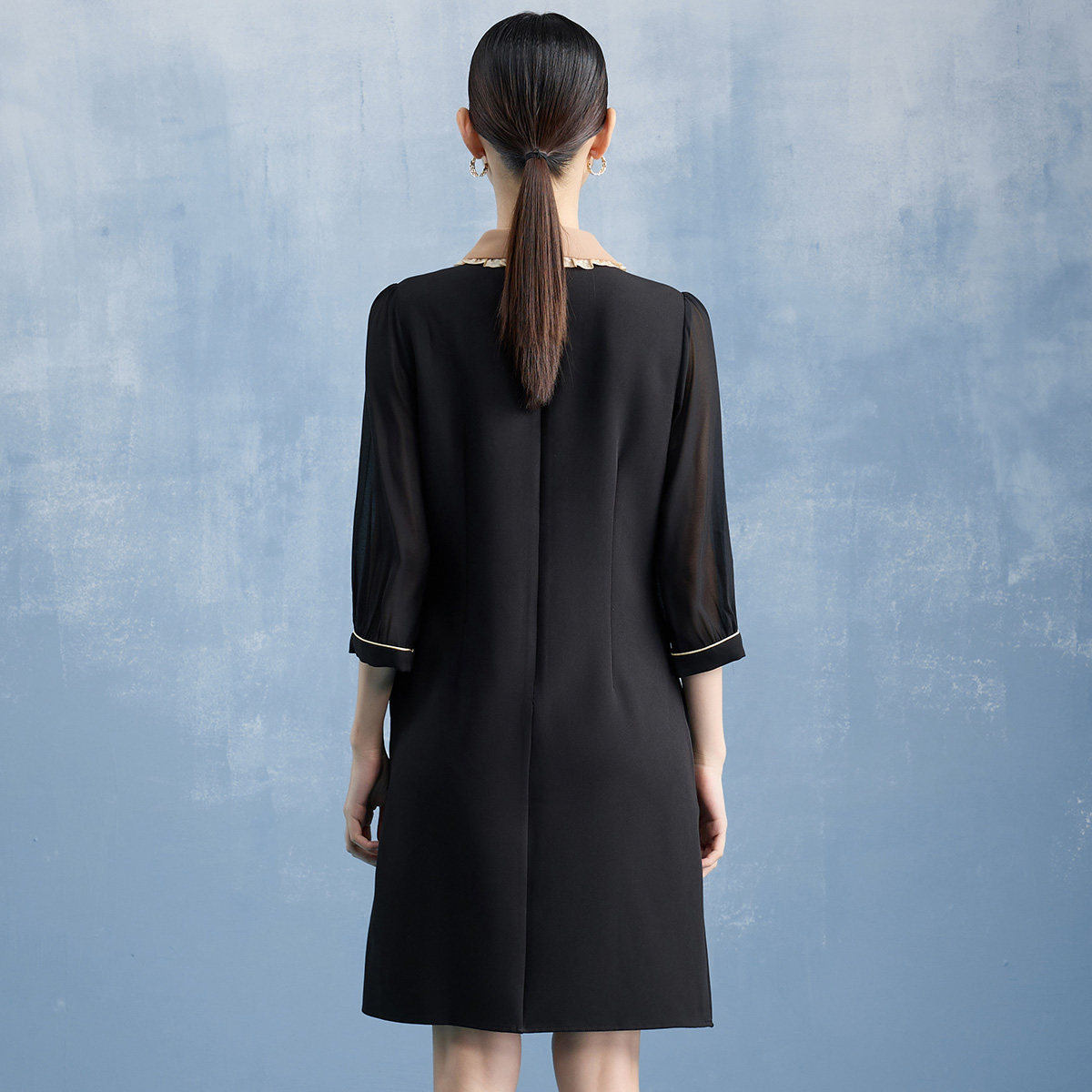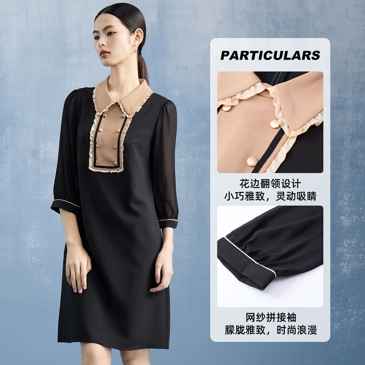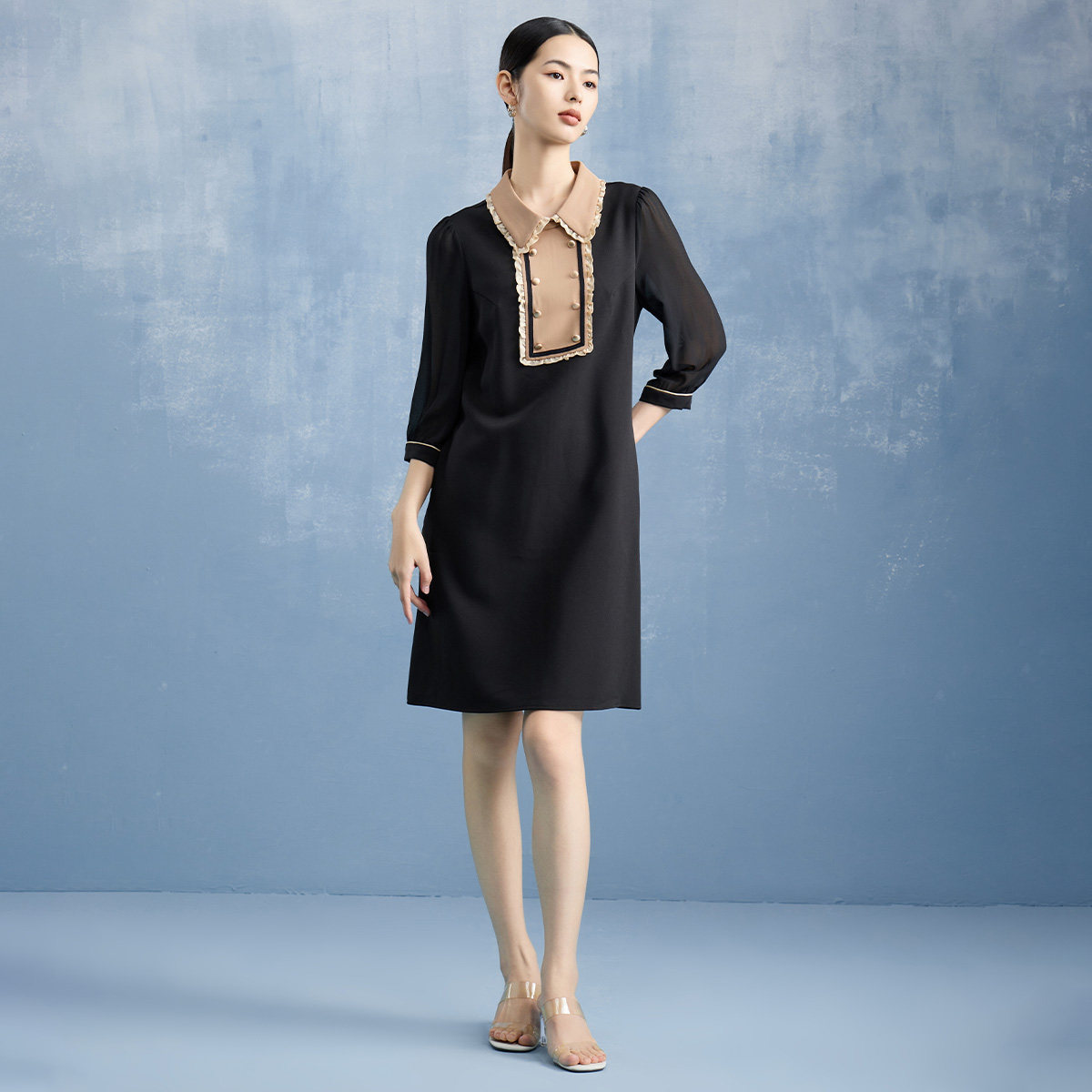 马天奴春秋新款黑色娃娃领连衣裙子拼接撞色复古气质女装时尚百搭