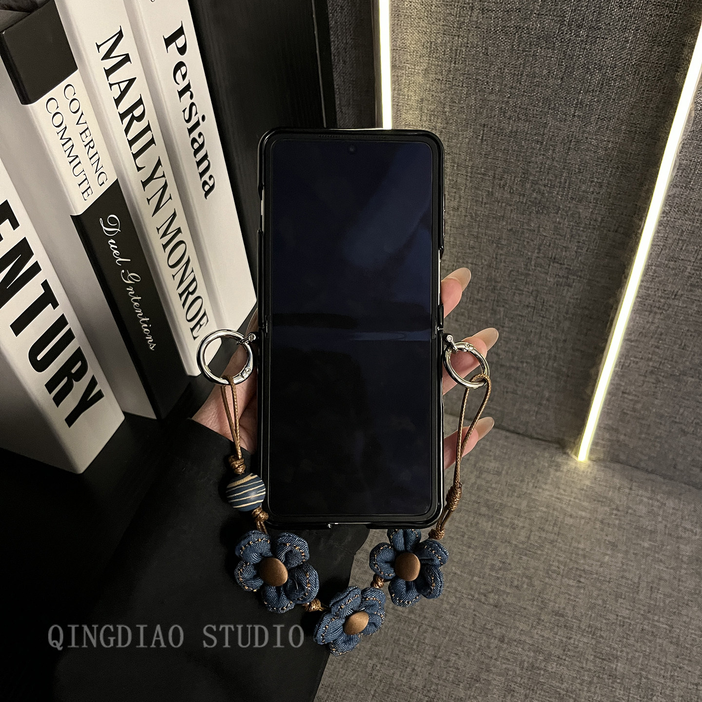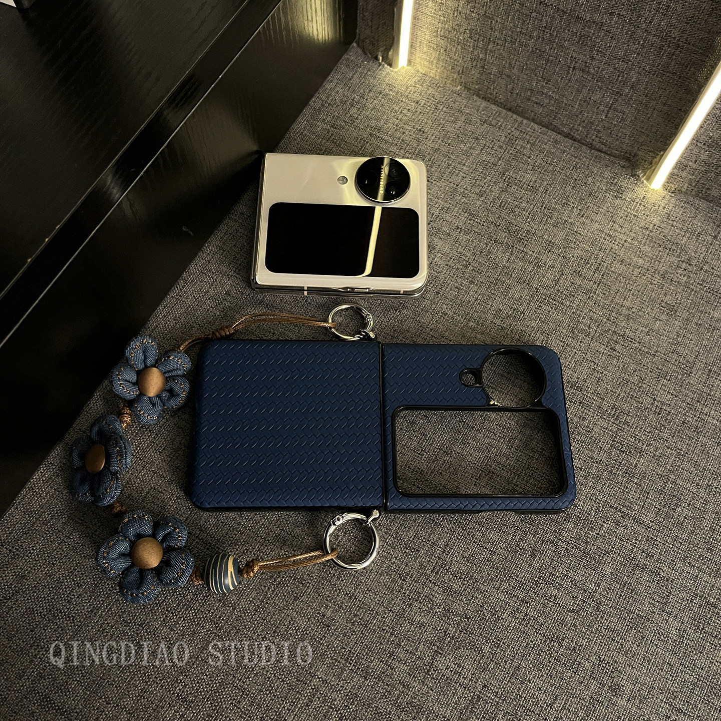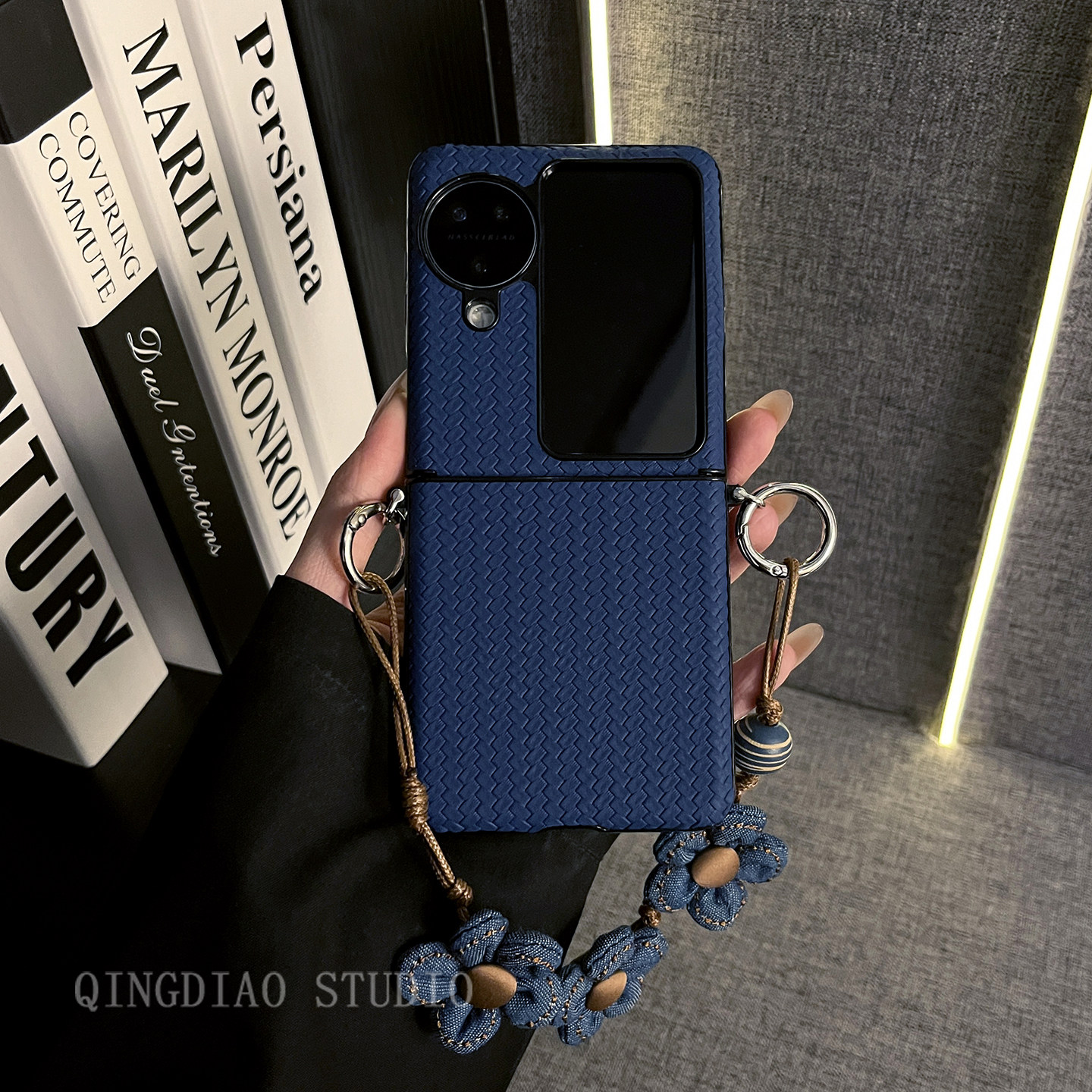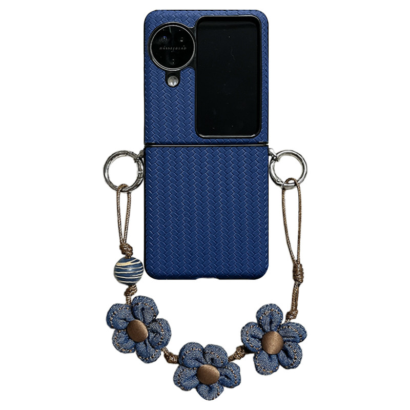 轻调 网红奢华深蓝草席纹花朵手提绳适用于oppo findn3/2flip手机壳新款折叠屏网红超薄翻盖防摔保护套手机壳