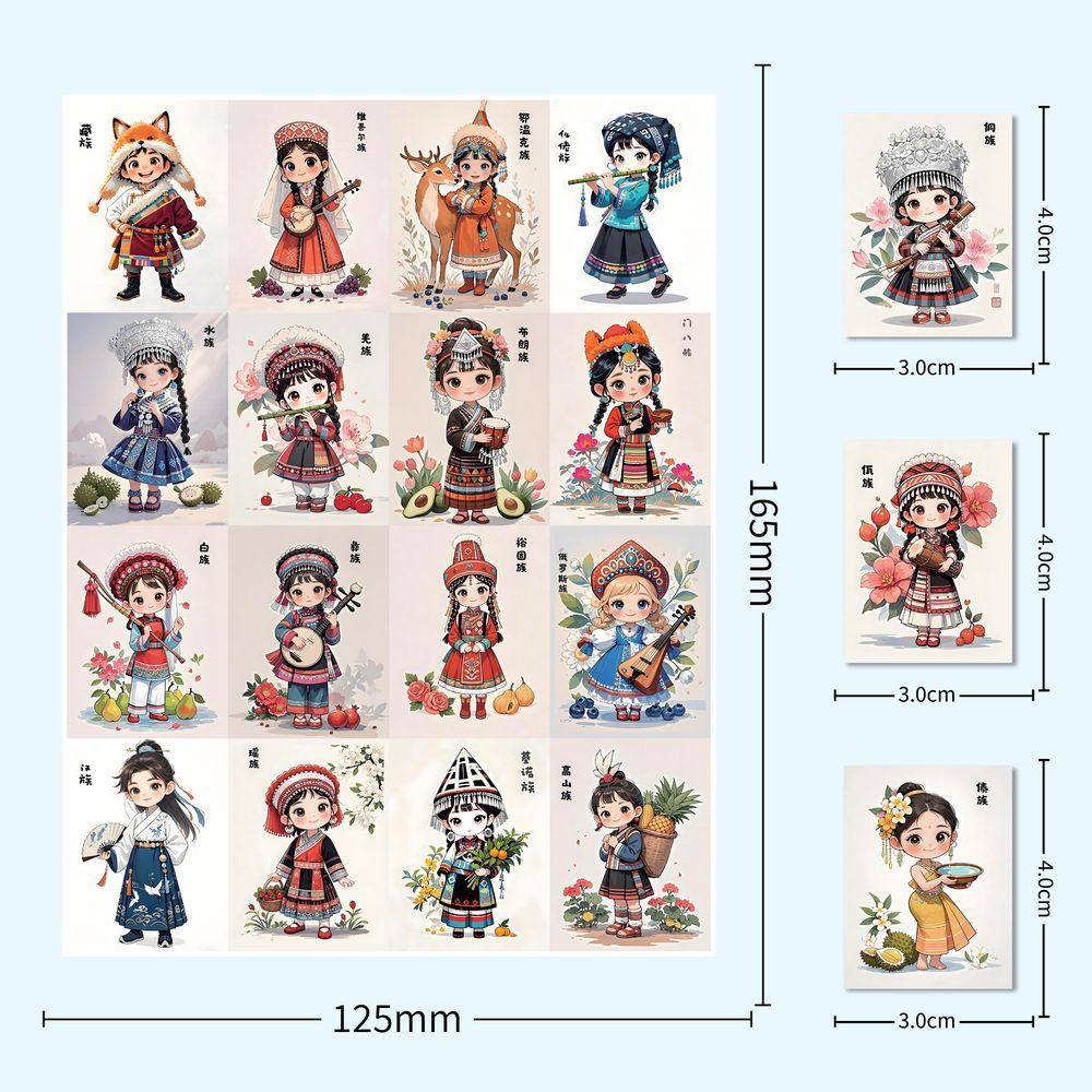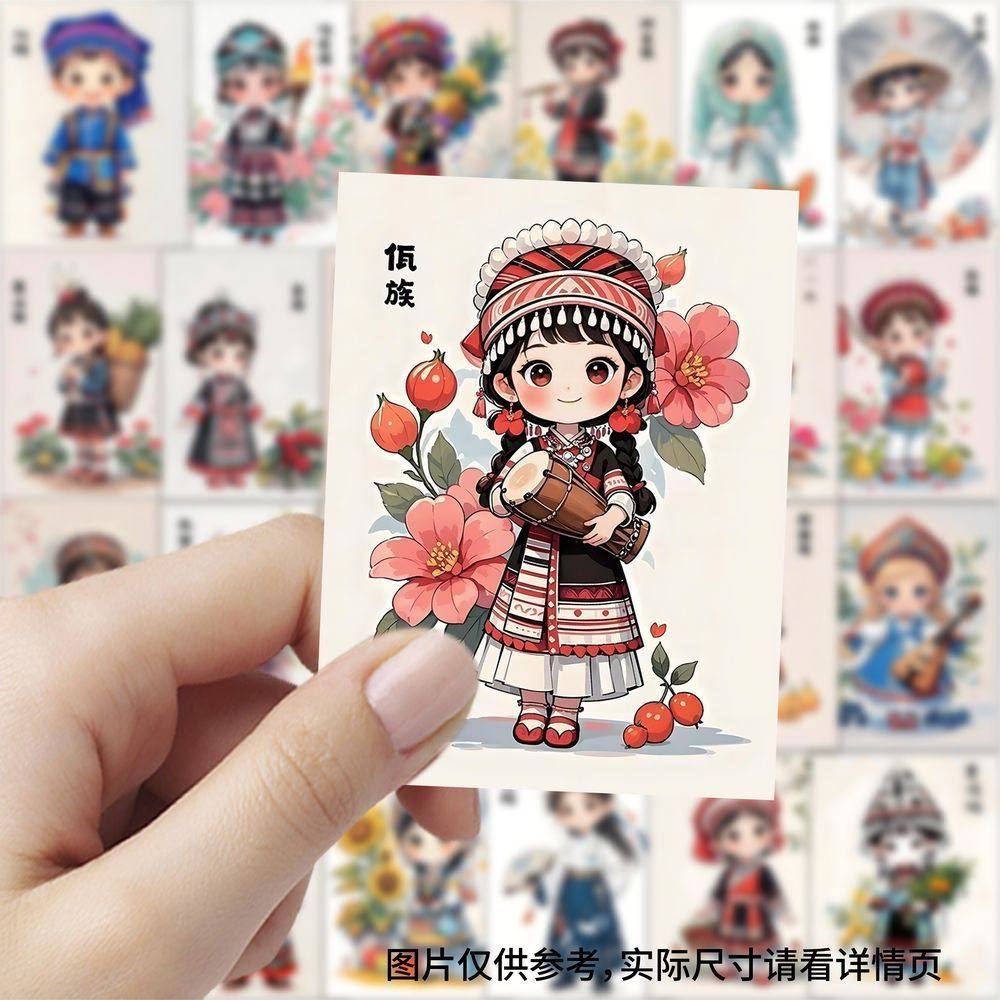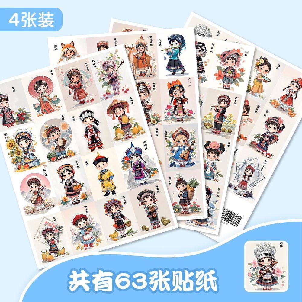 63张张民族服饰贴纸卡通古风国潮插画女孩儿童装饰行李箱防水贴画
