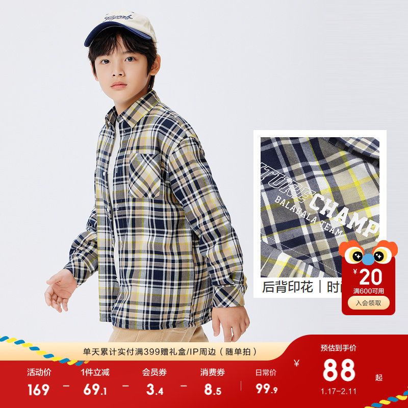 巴拉巴拉童装男童衬衫儿童长袖加绒中格子衬衣上衣红色拜年服喜庆
