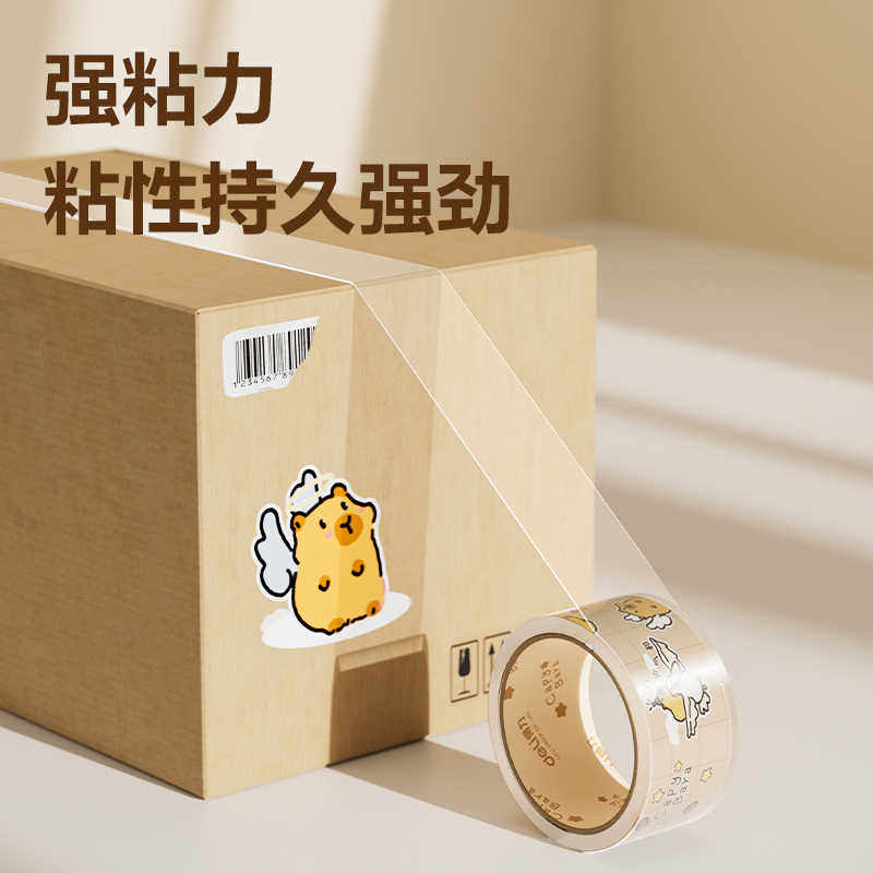 得力透明胶带大卷封箱胶布卡皮巴拉插画胶带批发大号加宽胶带封口高透明胶包装高粘度不易断超市快递打包胶带