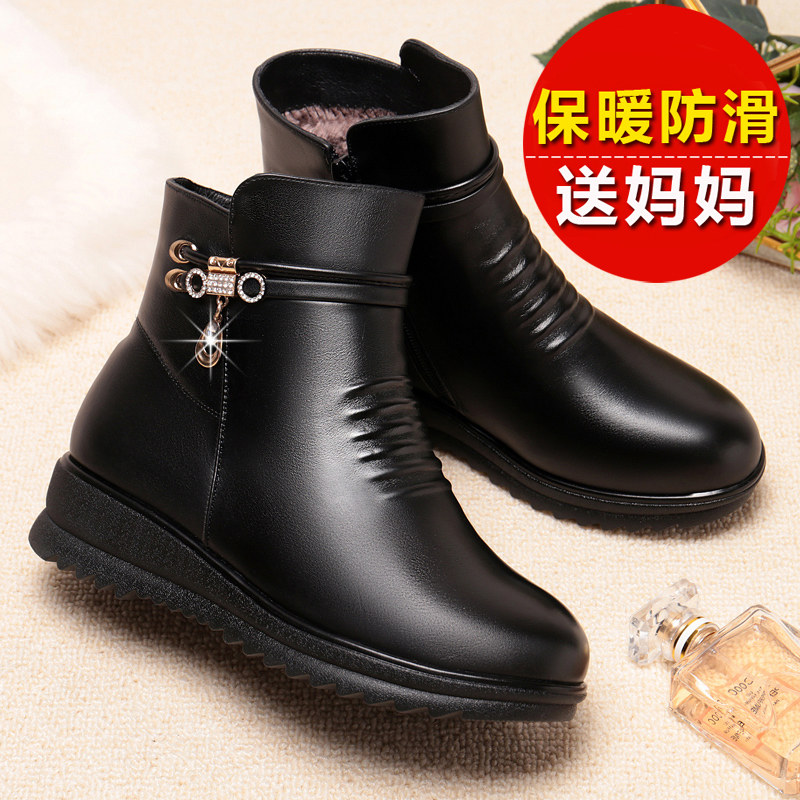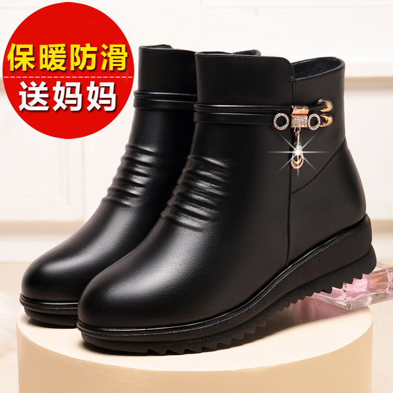 秋冬季加绒保暖妈妈棉鞋女真皮短靴女中老年女士棉靴坡跟防滑防水