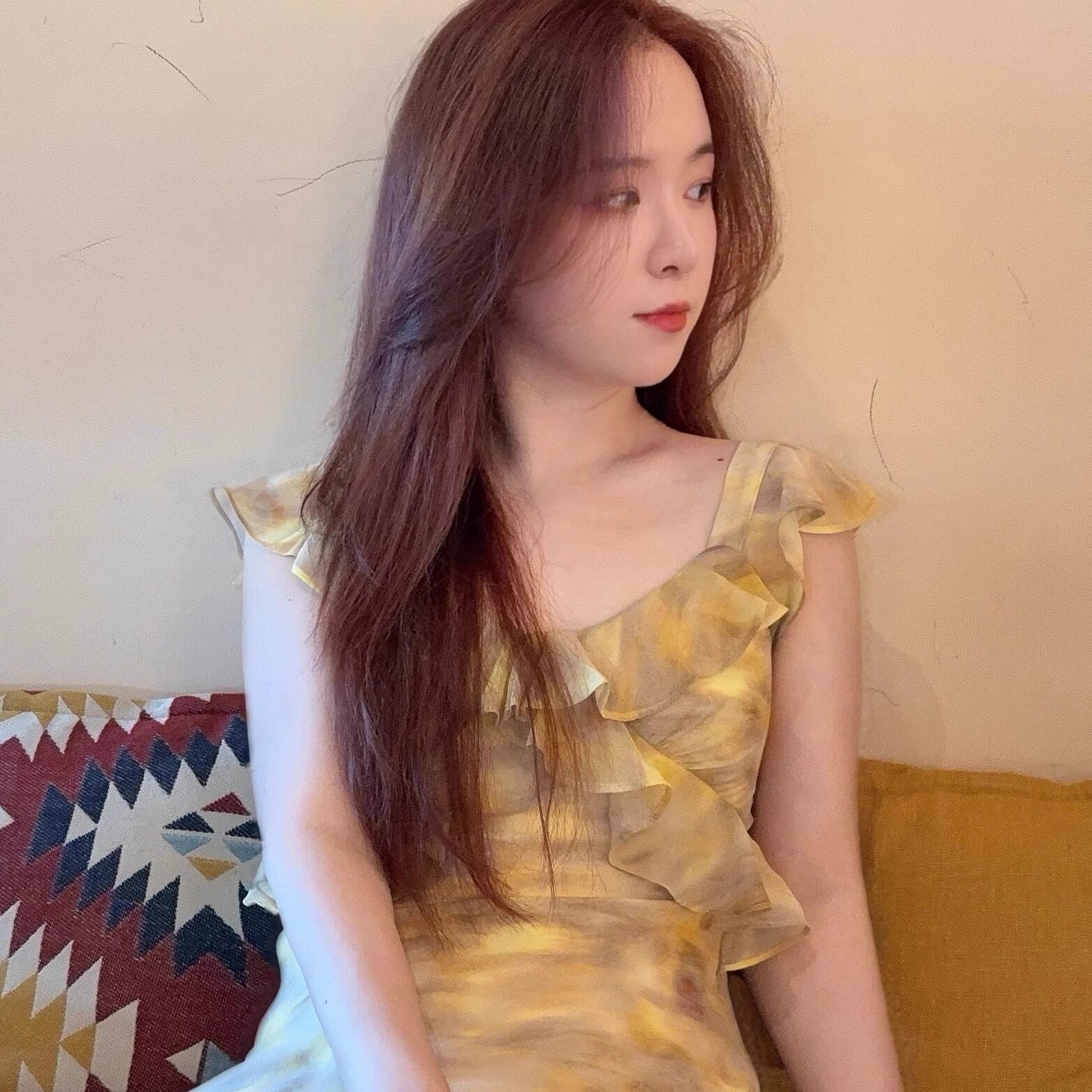 雨菲2025夏新款碎花v领飞飞边清冷大美人设计感显瘦斜裁连衣裙女