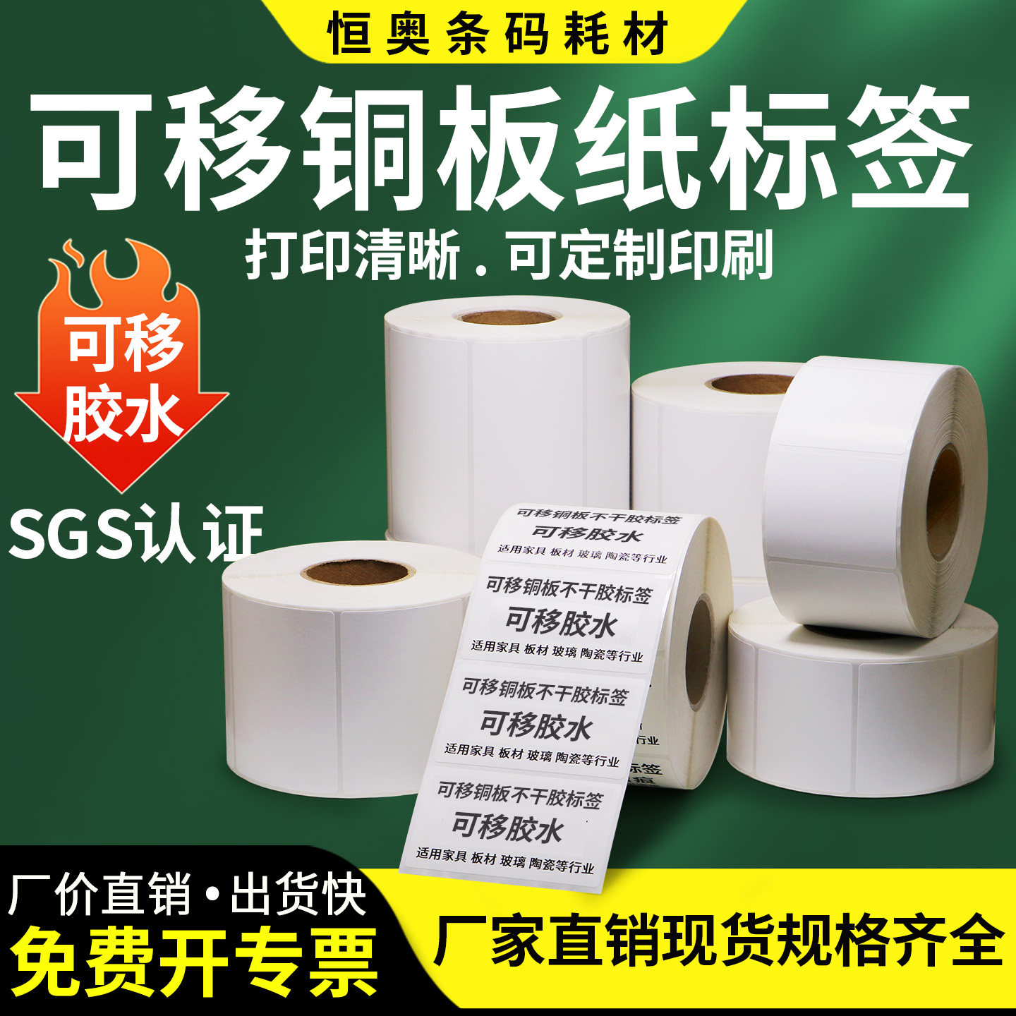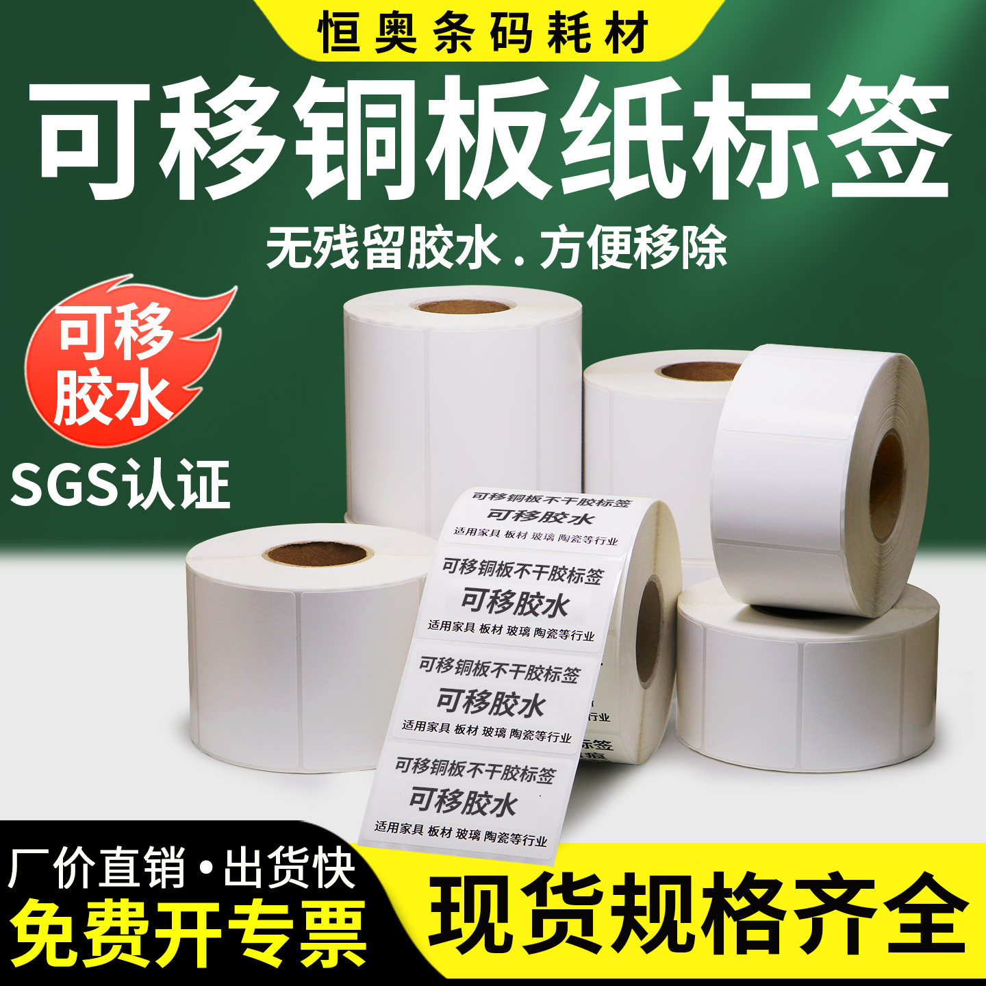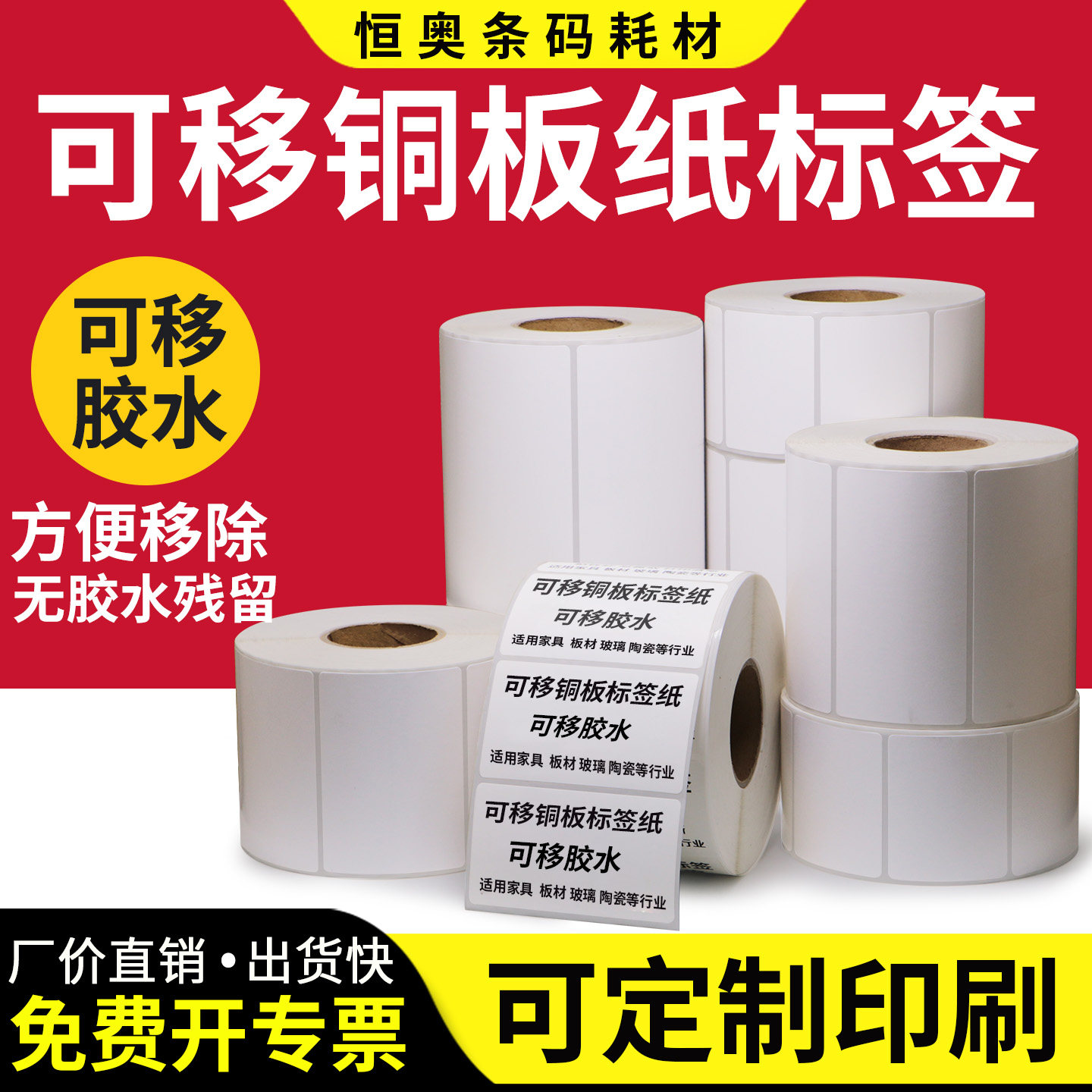 艾利可移铜版纸标签条码不干胶打印纸易撕取不留胶无残留板材玻璃家具陶瓷工艺品空白贴纸碳带打印定制logo