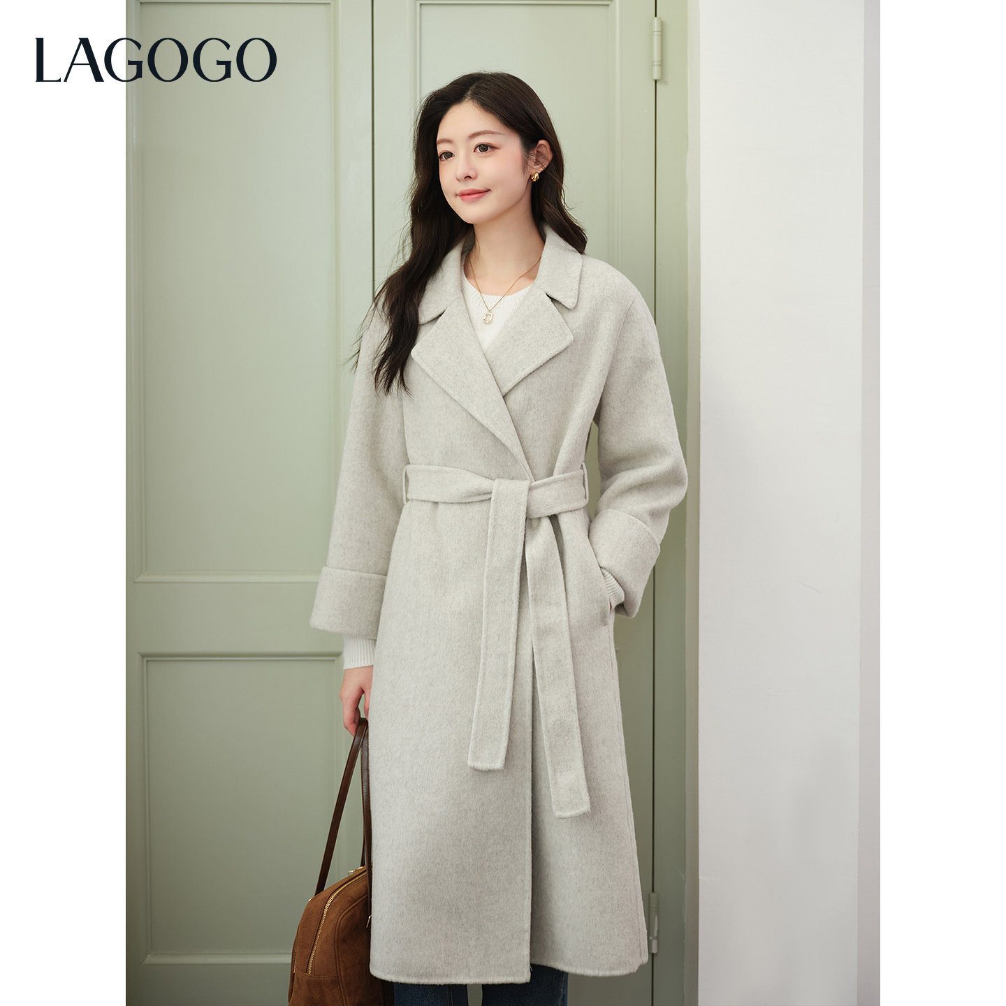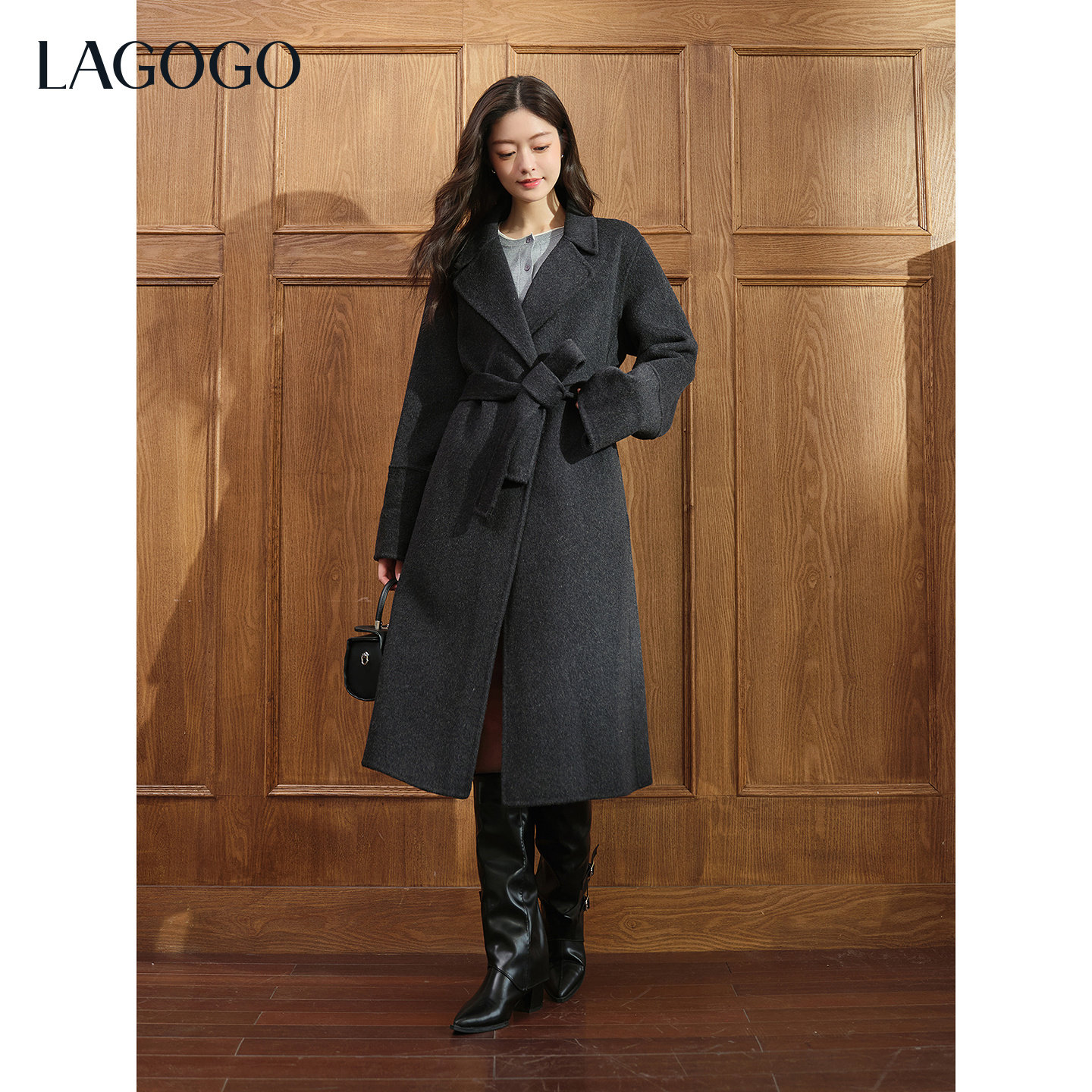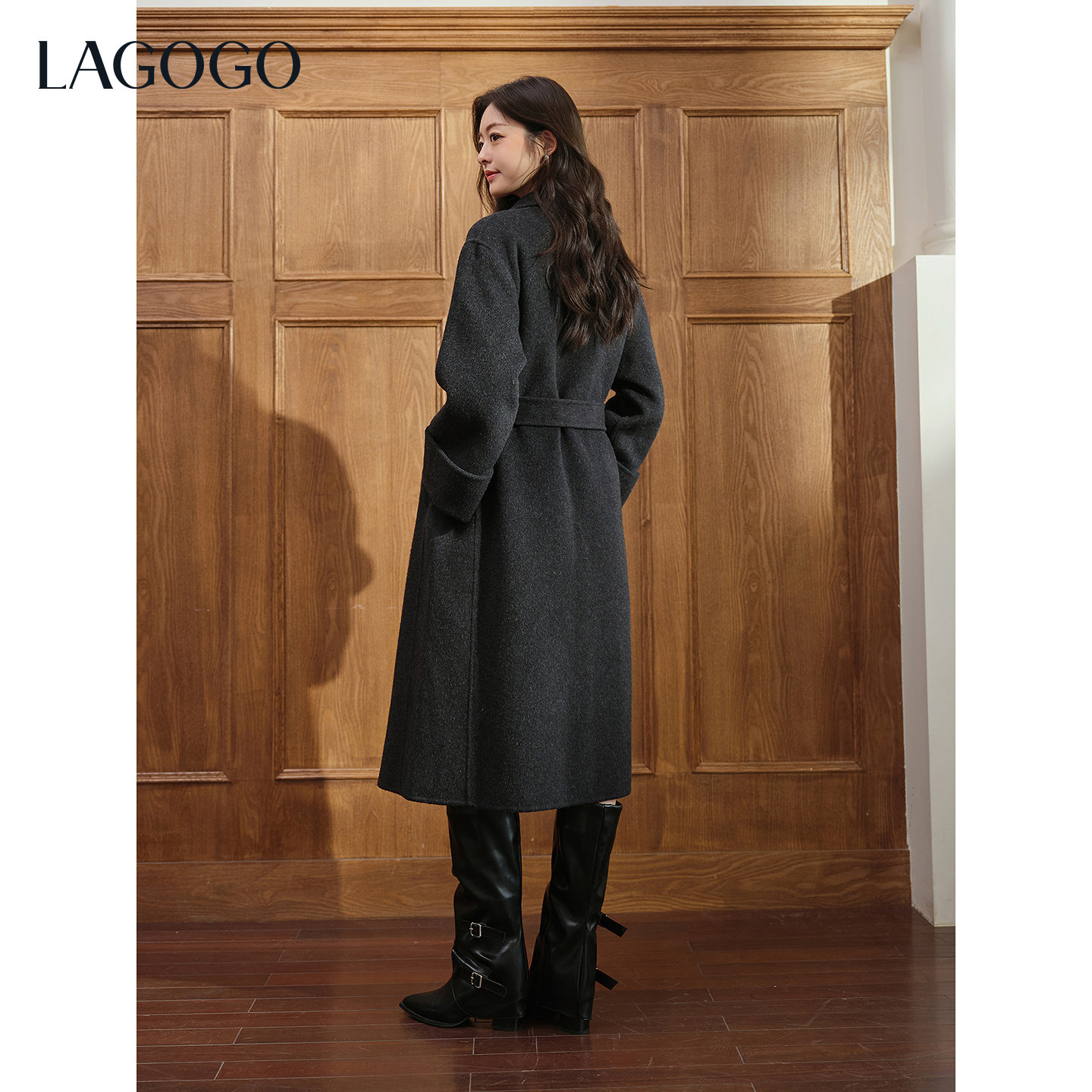 LAGOGO深灰洋气长款双面呢大衣女拉谷谷2025年冬新款优雅羊毛外套