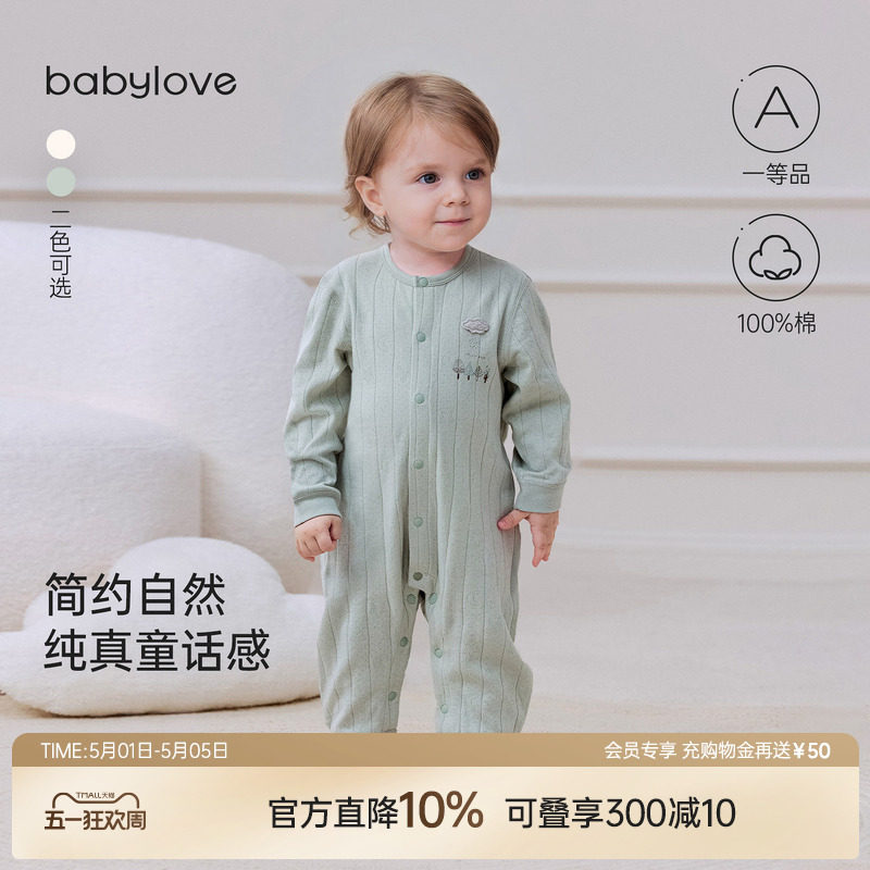 babylove婴儿连体衣春夏A类纯棉双层提花透气纯色爬服宽松不束缚
