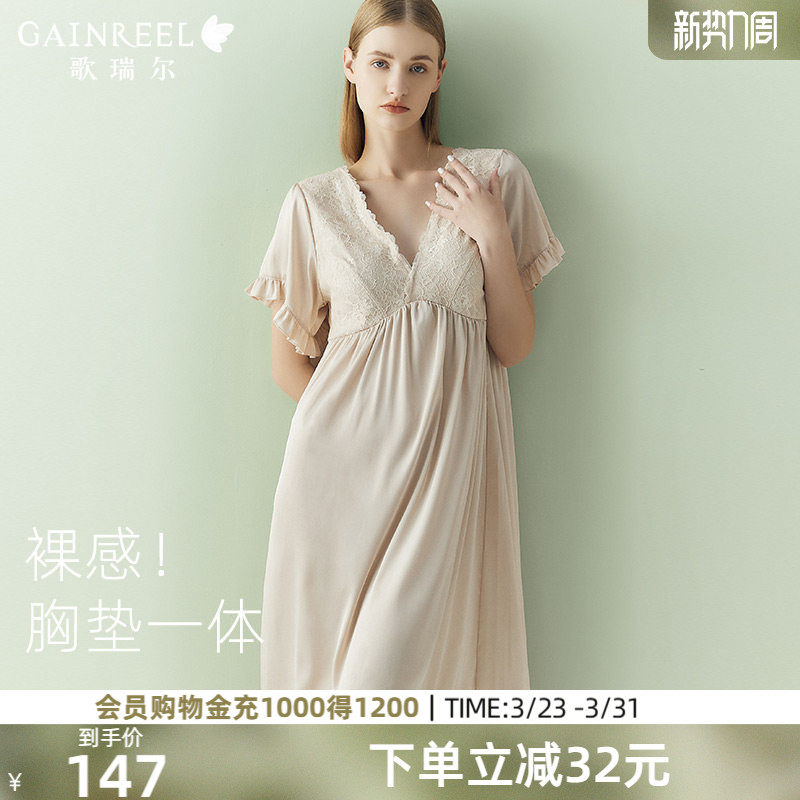 睡衣女款歌瑞尔新款带胸垫深V透气蕾丝性感裸感睡裙短袖家居服