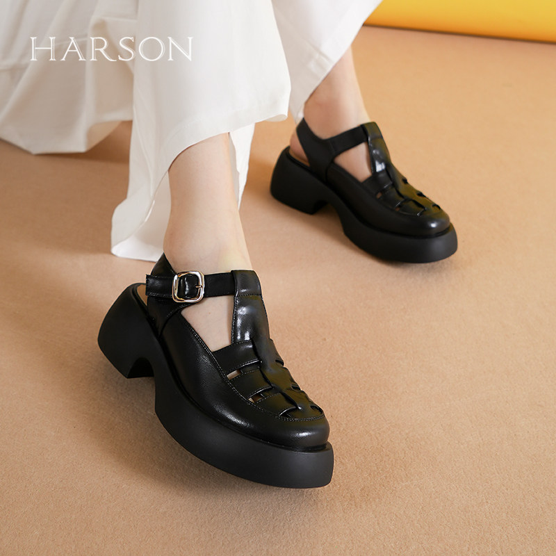 哈森真皮编织罗马凉鞋女夏季新款增高粗跟凉鞋HWM250120