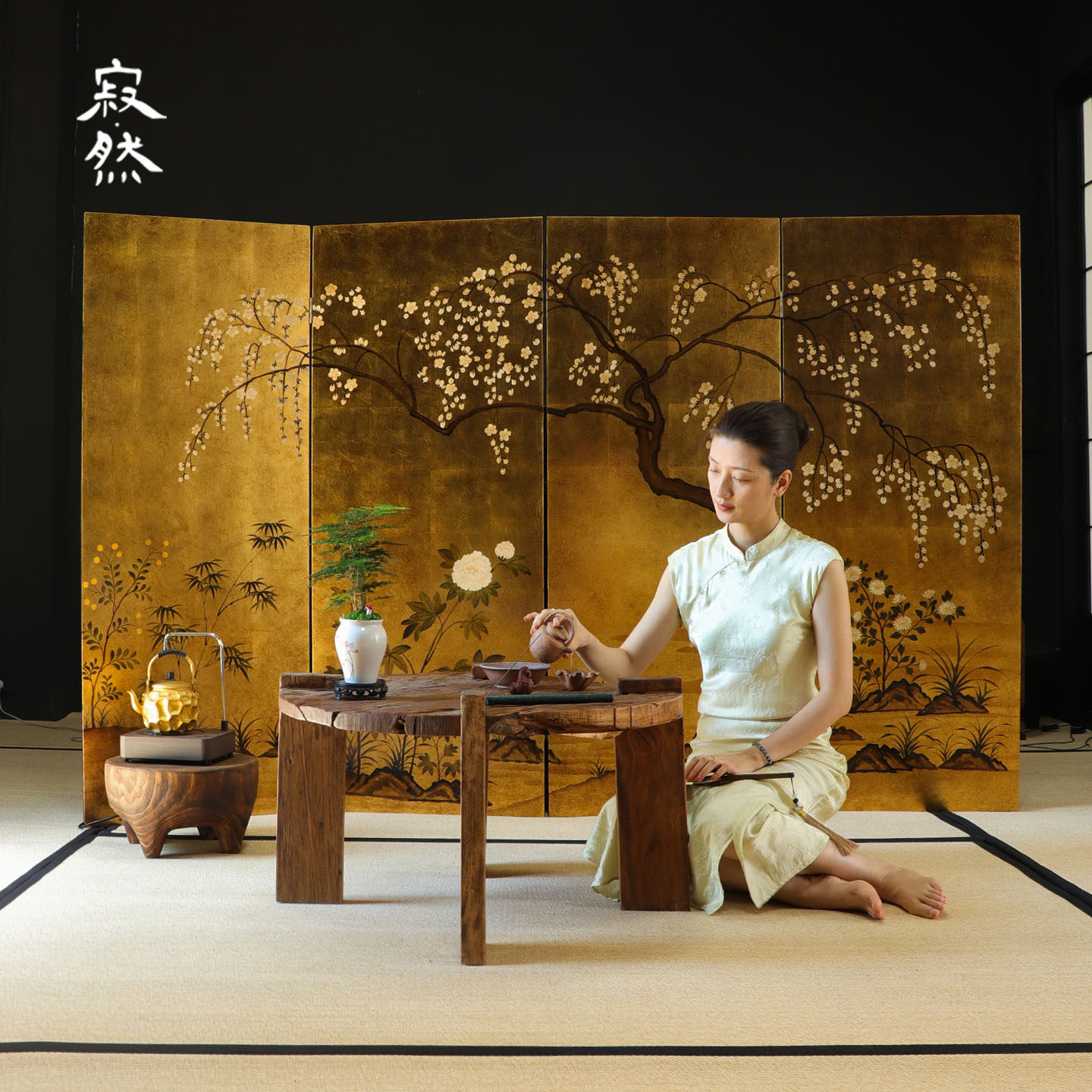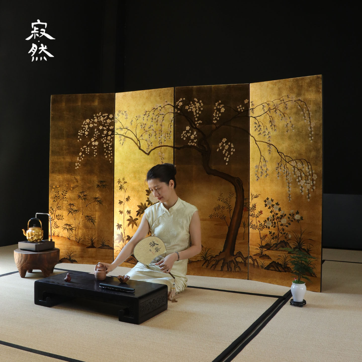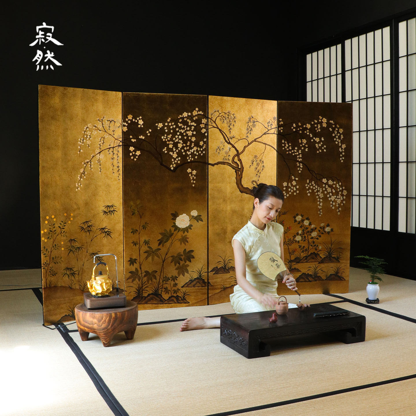 寂然 |日式复古折叠金箔屏风梅花山水屏风茶室客厅装饰画中式折屏