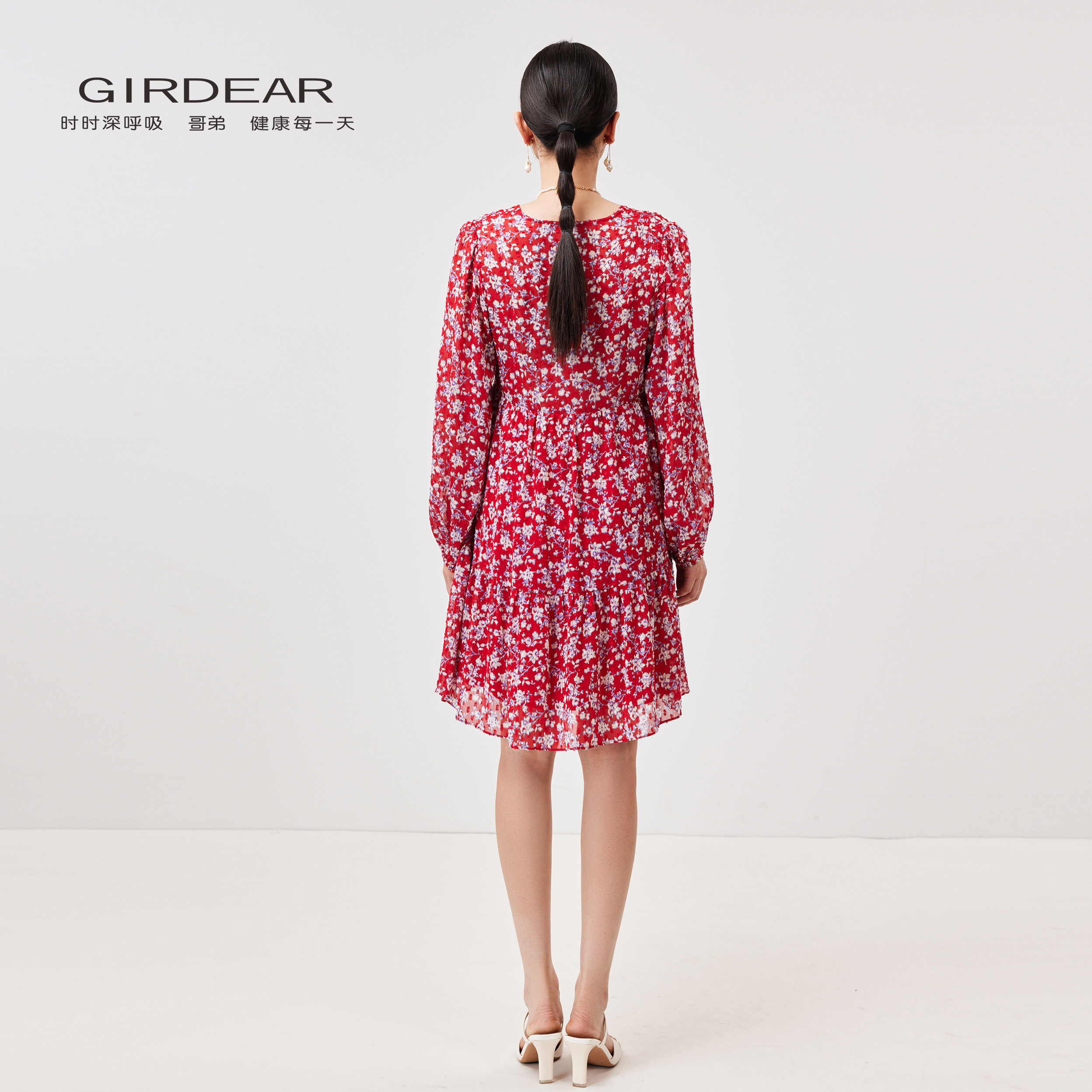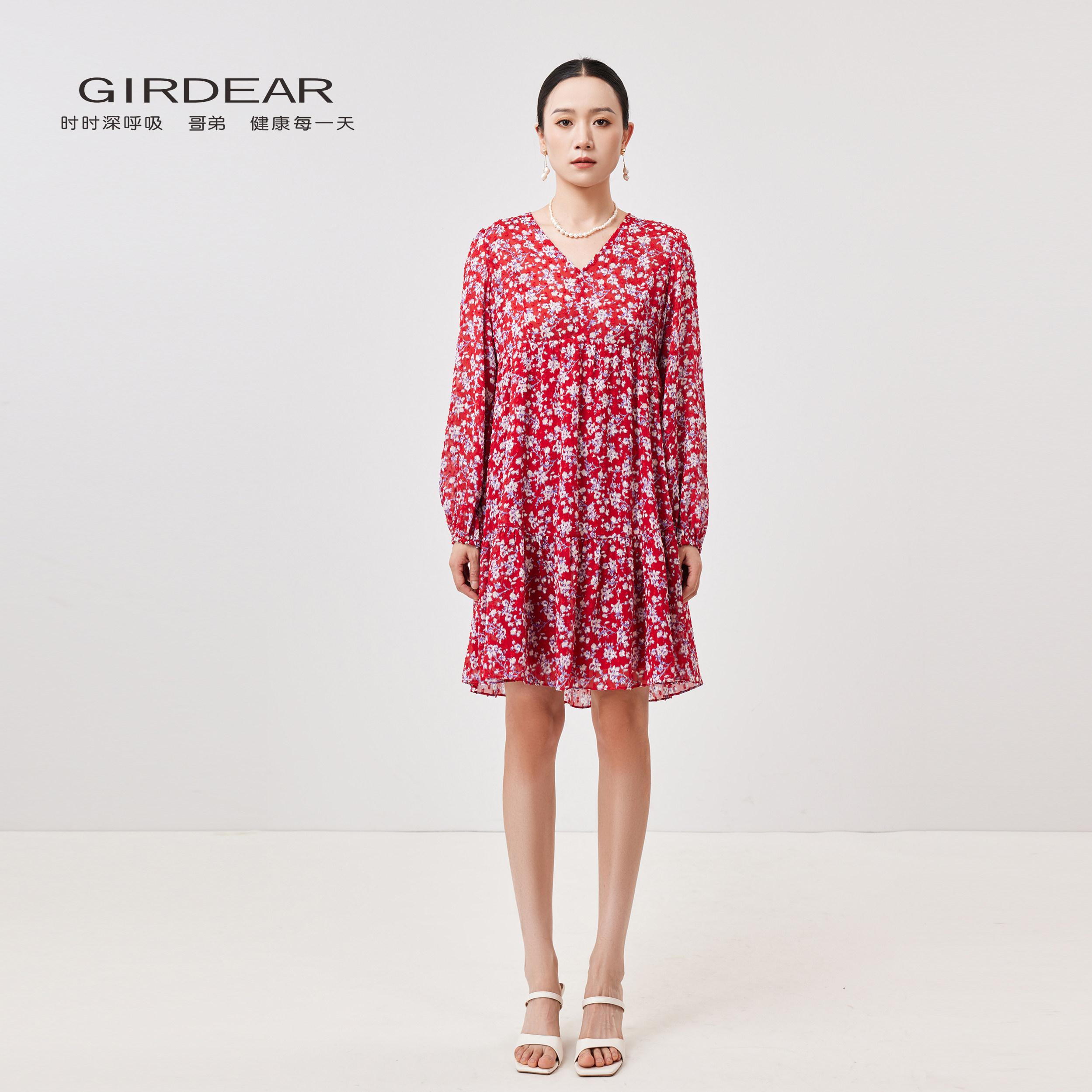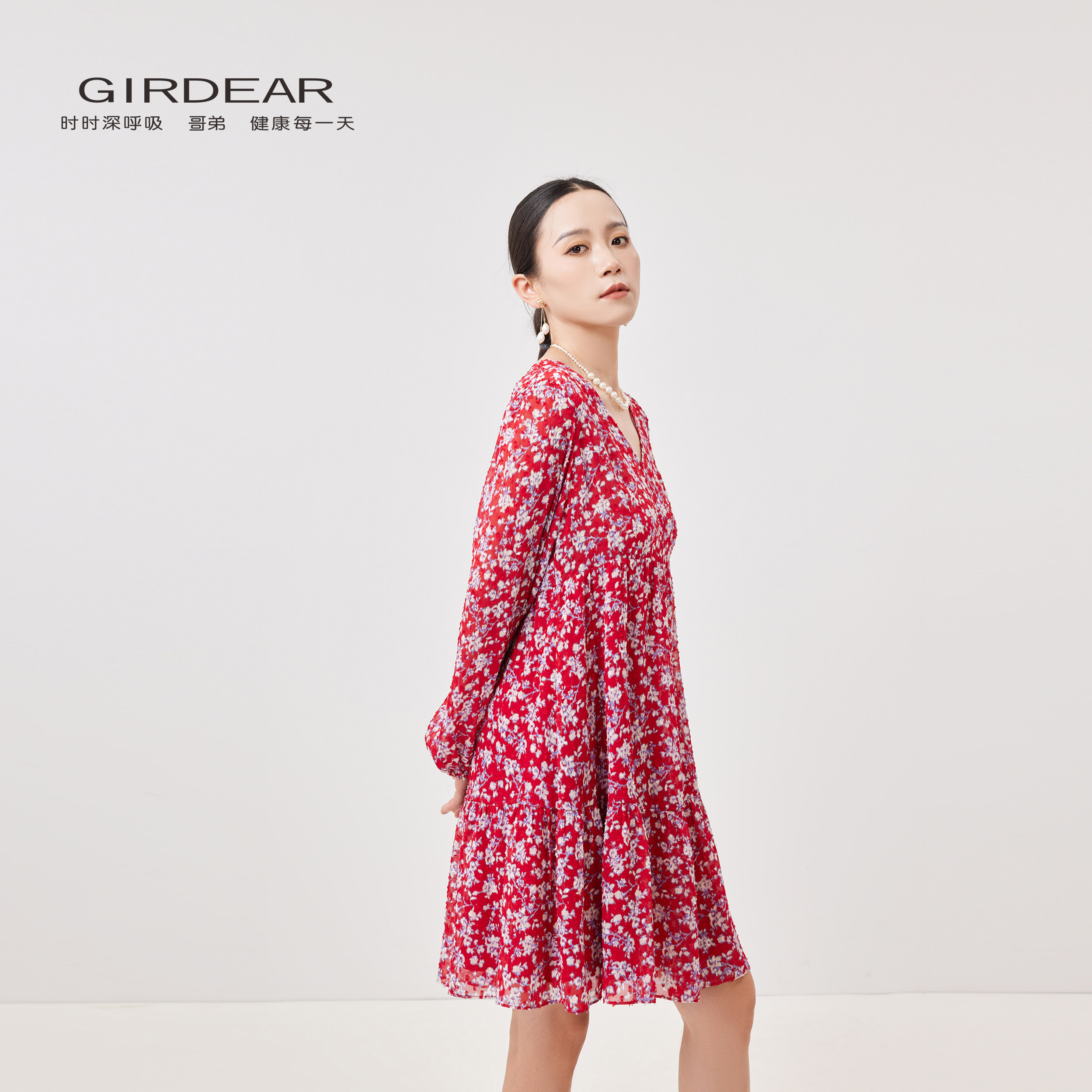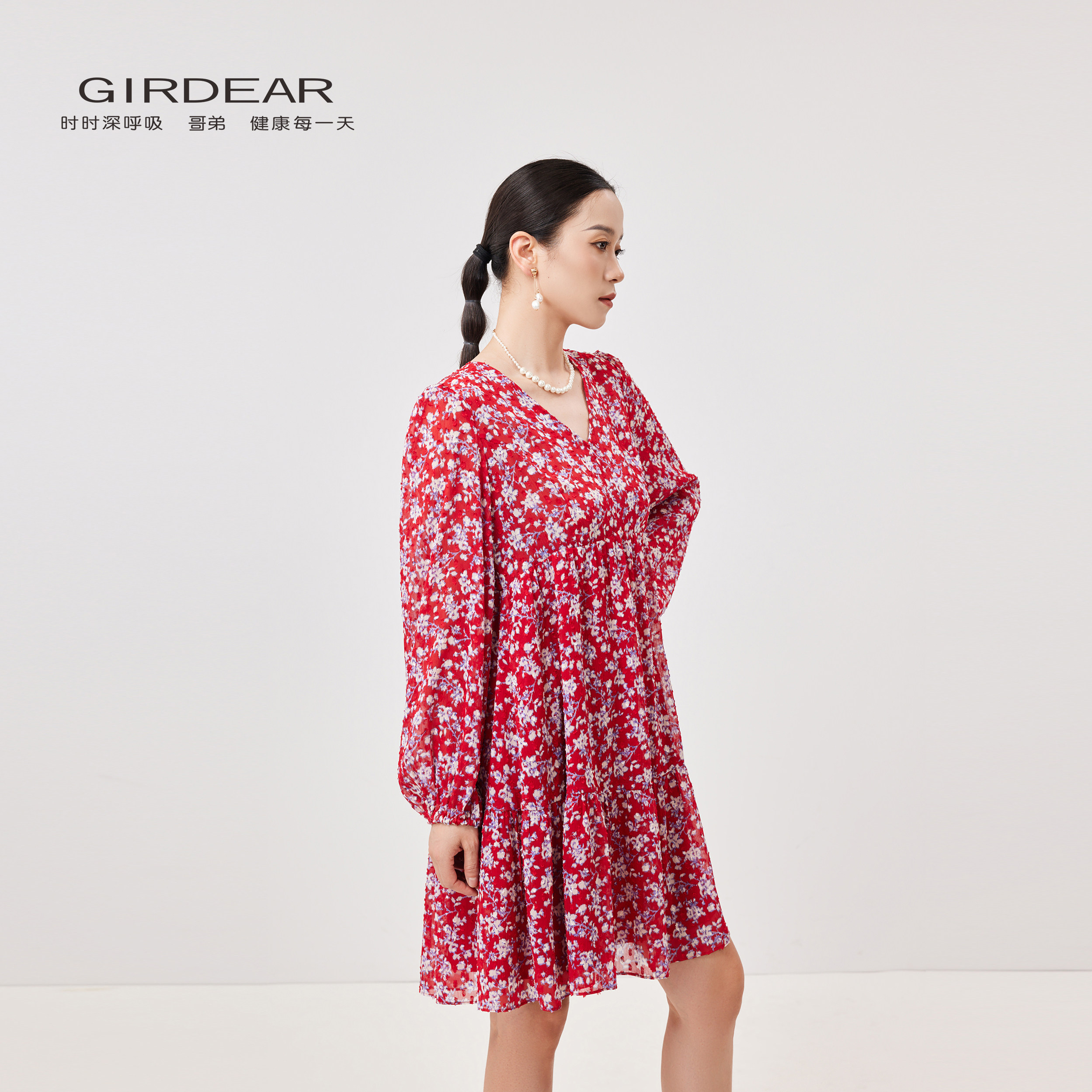 Girdear/哥弟早春新款V领碎花连衣裙长袖显瘦收腰150002