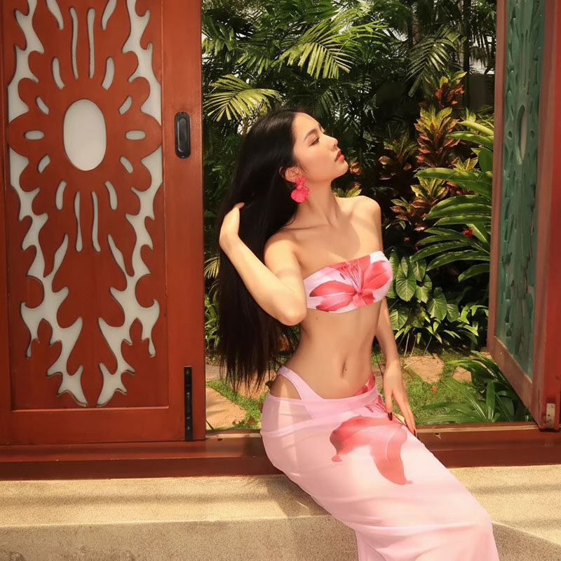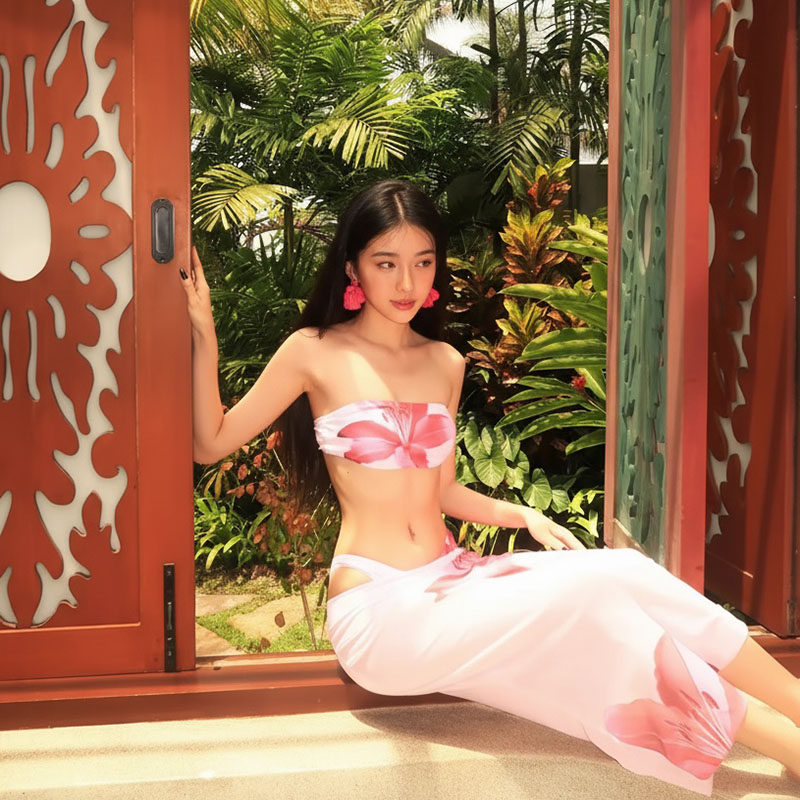 跨境新款印花三点式比基海岛度假性感显瘦抹胸吊带泡温泉分体泳衣