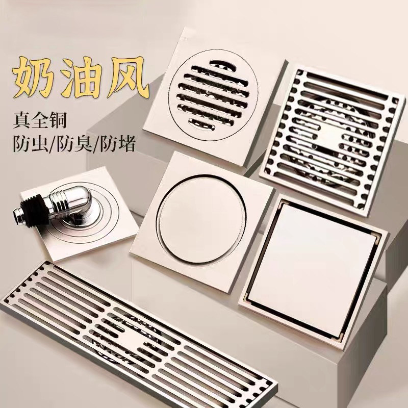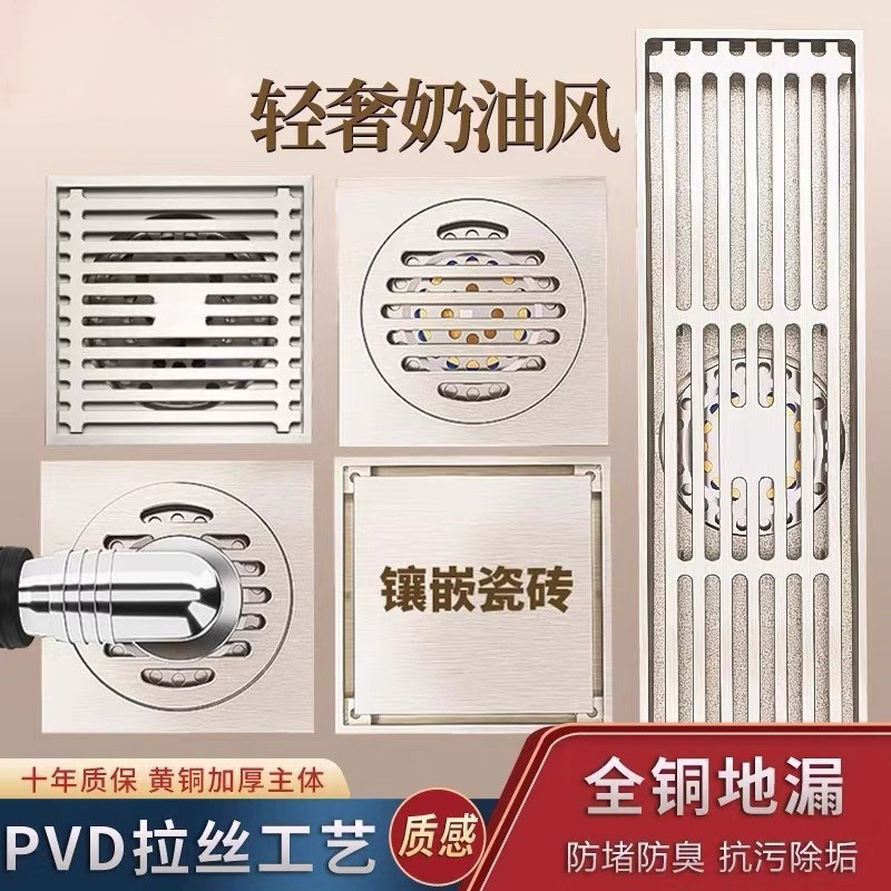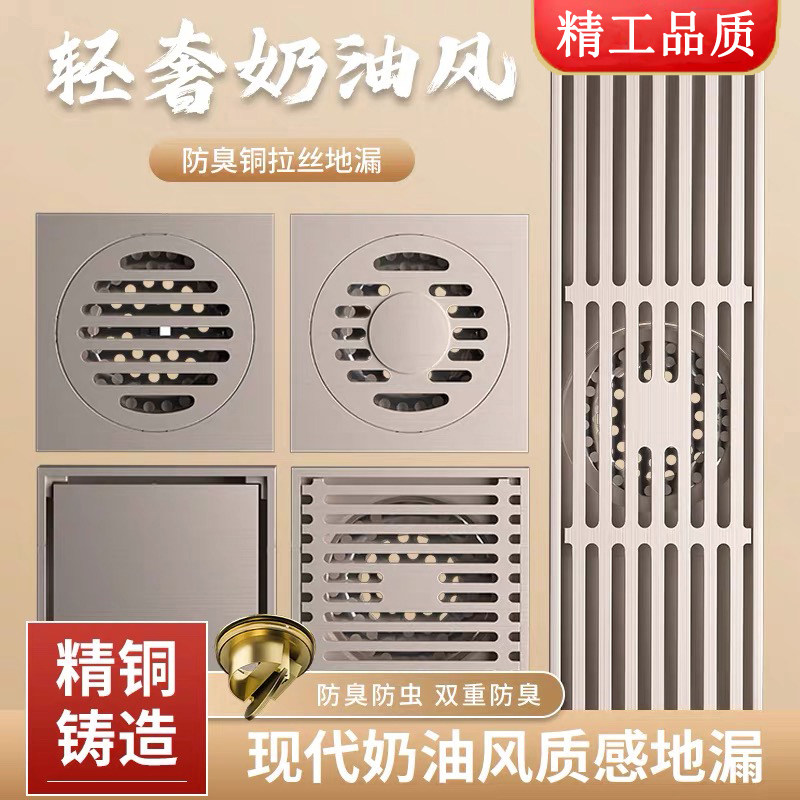 奶油风全铜防臭地漏拉丝洗衣机卫生间黄铜隐形淋浴排水密封两用