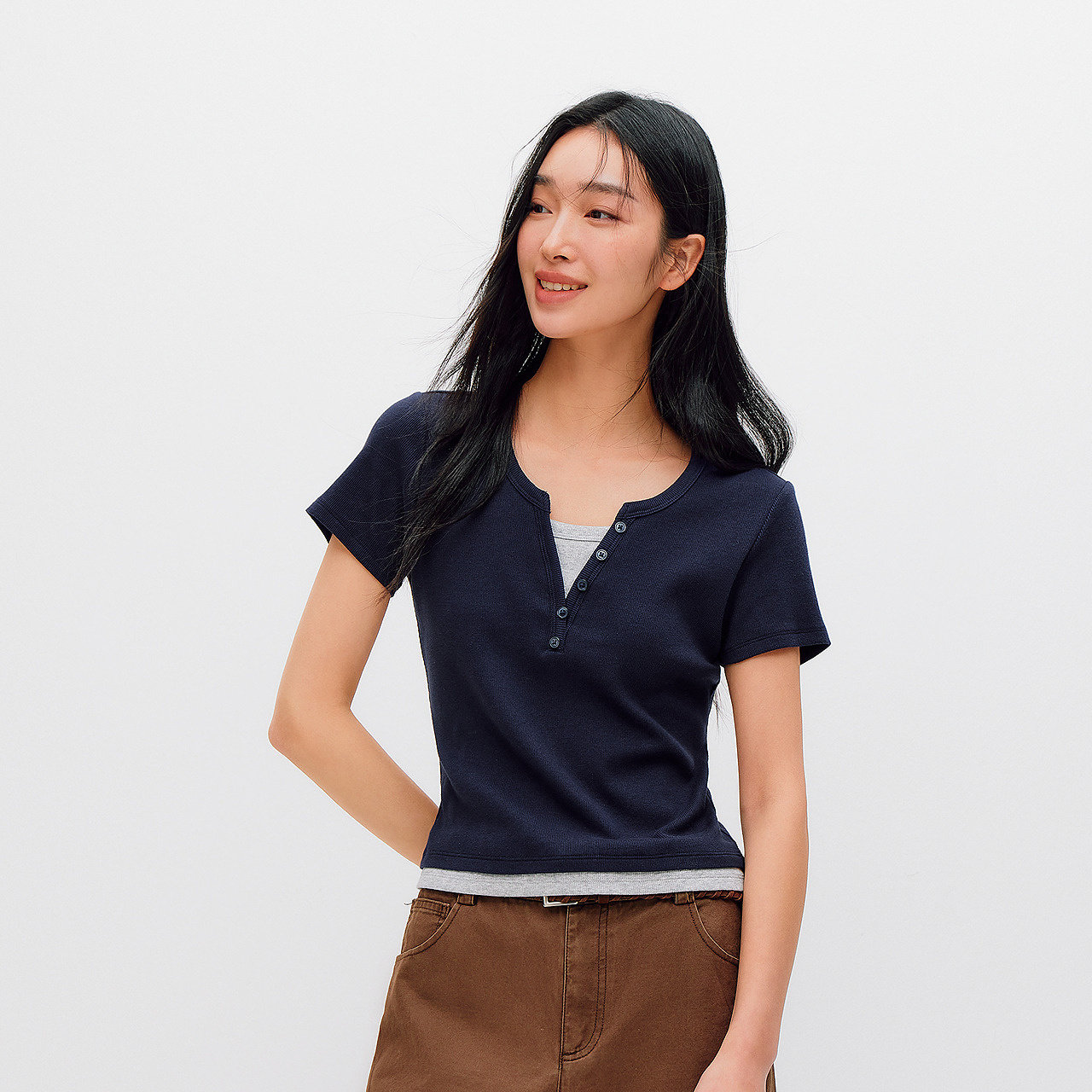 蕉下亨利衫女长袖T恤v领秋冬修身保暖低领打底衫半开领白色上衣