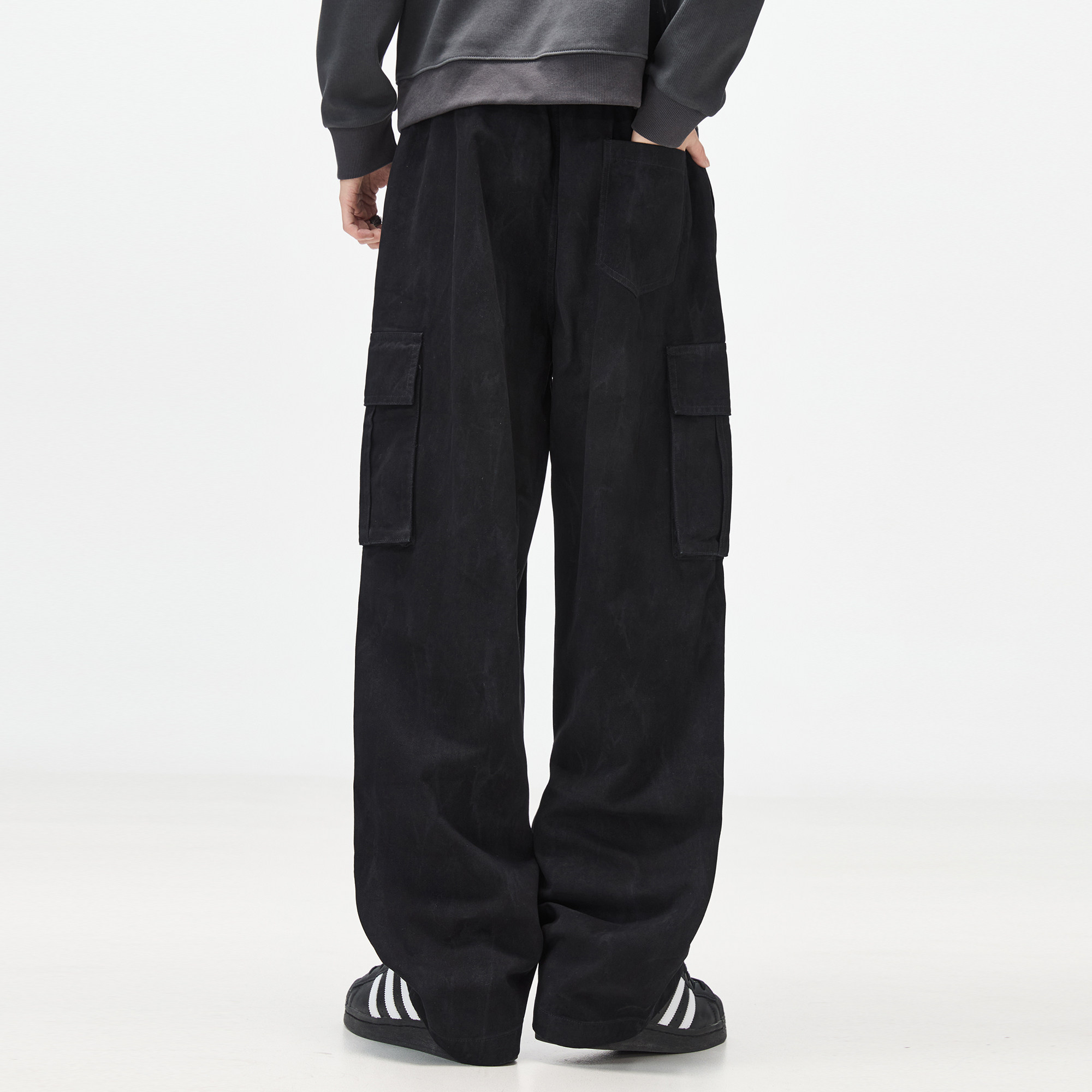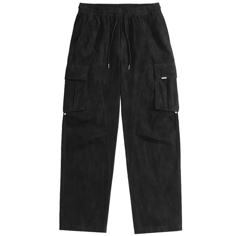 ALLIN 美式重磅褶皱工装裤男春秋宽松潮流阔腿百搭休闲黑色长裤子