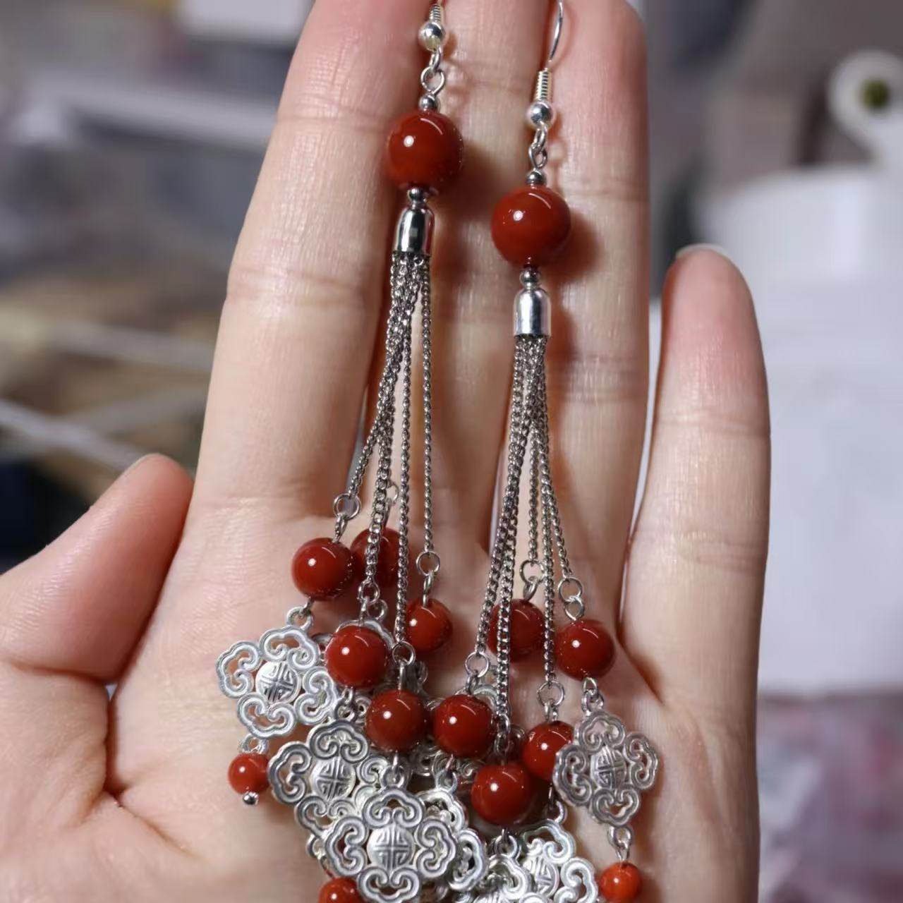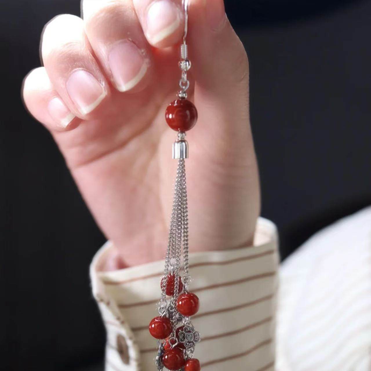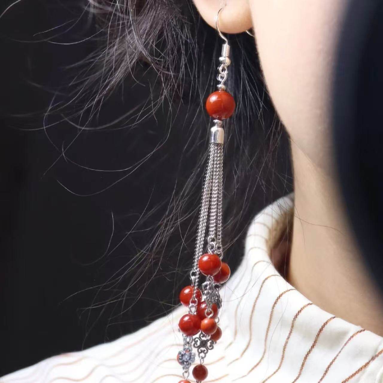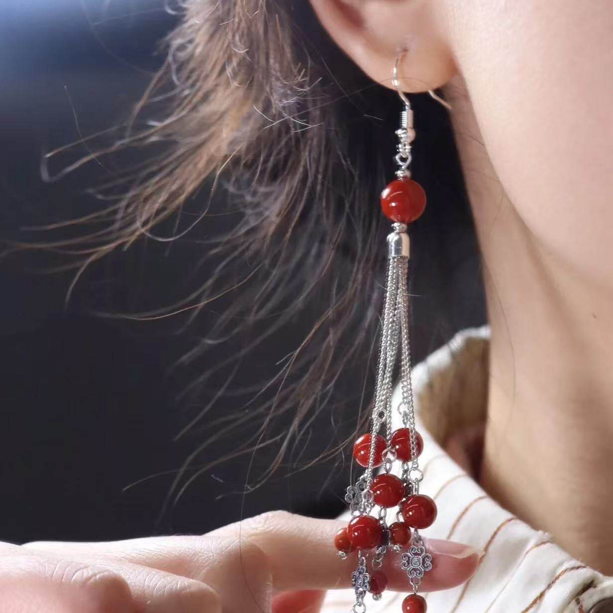 野蛮生长苏文琪陈朵同款耳环仿南红玛瑙长款流苏民族风耳饰女爱心